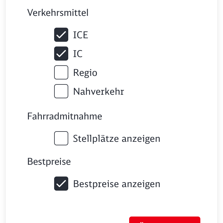 Checkboxen eignen sich optimal für die Filterung von Inhalten. Dabei können auch Einträge mit nur einer Option (siehe Fahrradmitnahme und Bestpreise) aufgeführt werden.