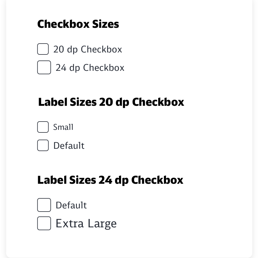 Checkboxen existieren in einer 20 dp sowie einer 24 dp Ausprägung. Zudem lässt sich die Größe des Labels individuell anpassen.