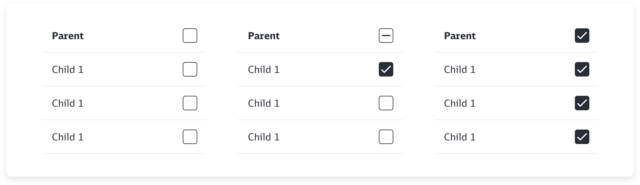 Checkboxen in einer hierarchischen Struktur bestehen aus einer Parent Checkbox sowie mindestens zwei Child Checkboxen. Die Auswahl (oder Nichtauswahl) der Child Checkboxen bestimmt den Zustand der Parent Checkbox (siehen Beispiel).