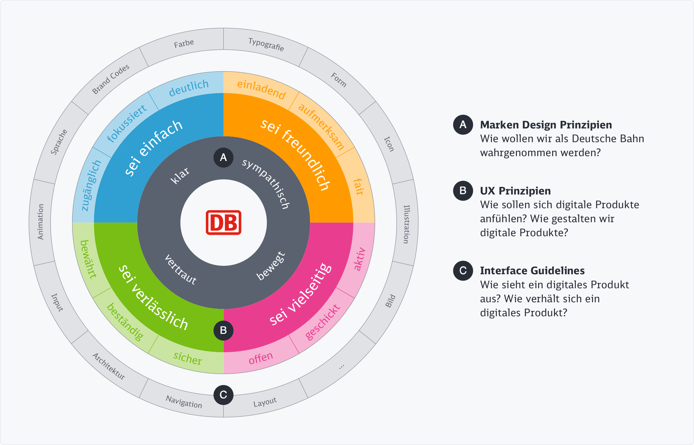 Die Deutsche Bahn wird als „klar, sympathisch, vertraut und bewegt“ wahrgenommen, indem sich die Services „einfach, freundlich, verlässlich und vielseitig“ anfühlen.