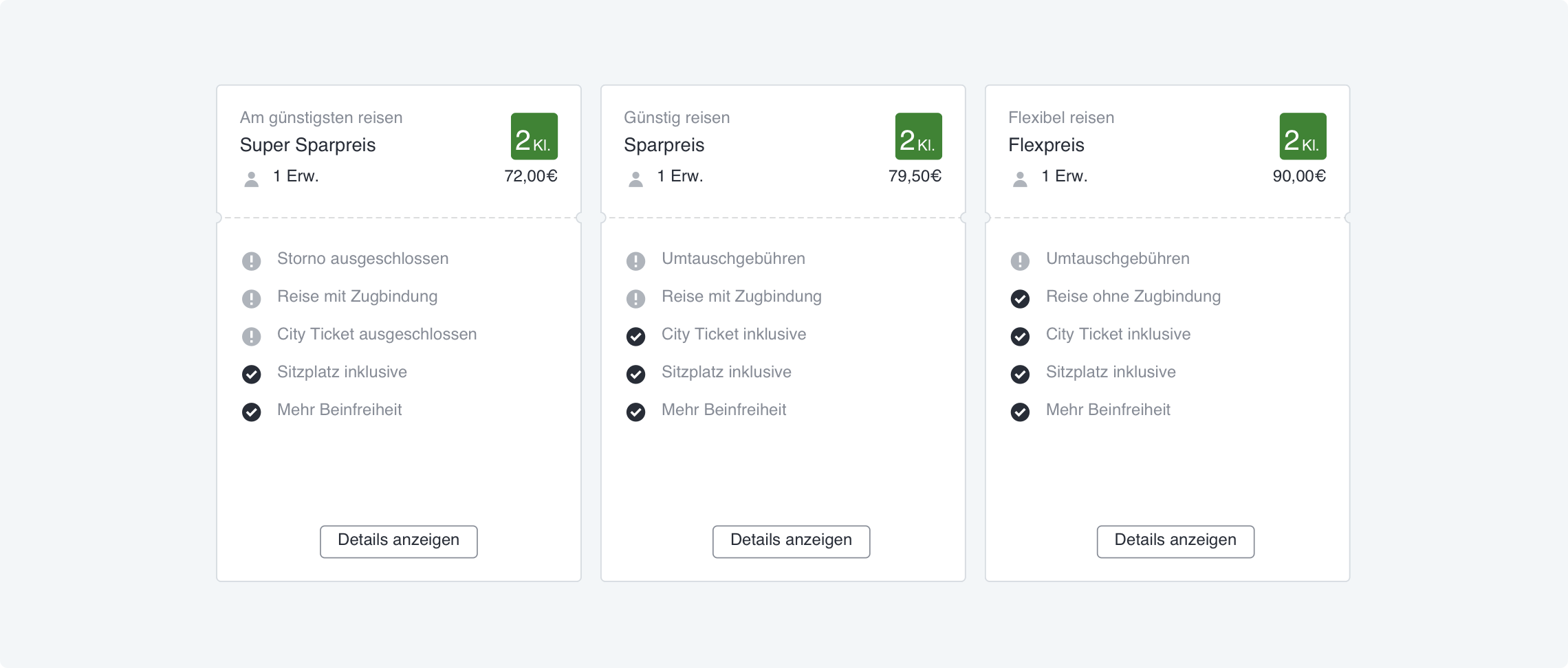 Beispiel: Positioniere Attribute von Angeboten an gleicher Stelle, um eine Vergleichbarkeit zu ermöglichen.
