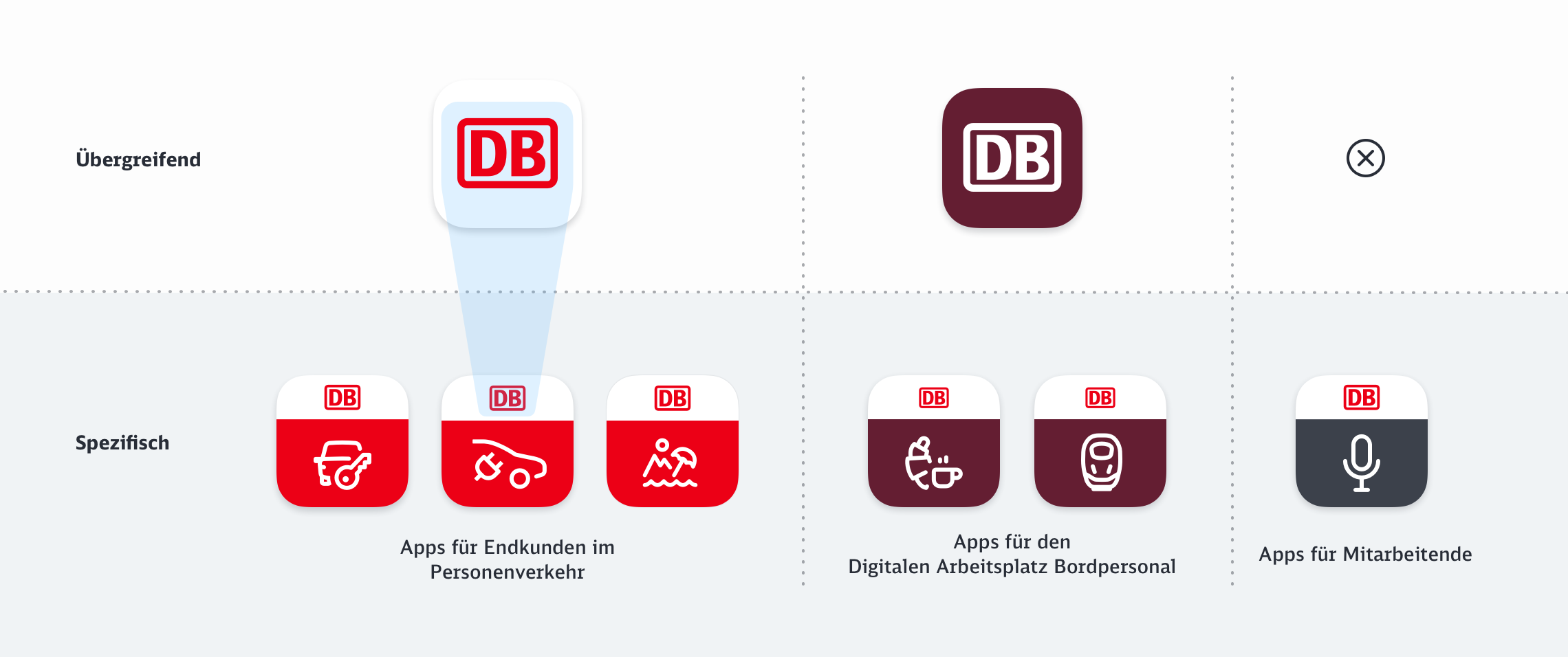 Übergreifend – für unser Ökosystem – steht das DB Logo, welches ausschließlich im DB Navigator ohne weitere Kennzeichnung nach Abstimmung mit GNM verwendet wird. Der DB Navigator dient als Leadapp für den Personenverkehr und der DAB Master entsprechend als Leadapp für den Digitalen Arbeitsplatz unserer Mitarbeitenden – mit zahlreichen untergeordneten Apps.