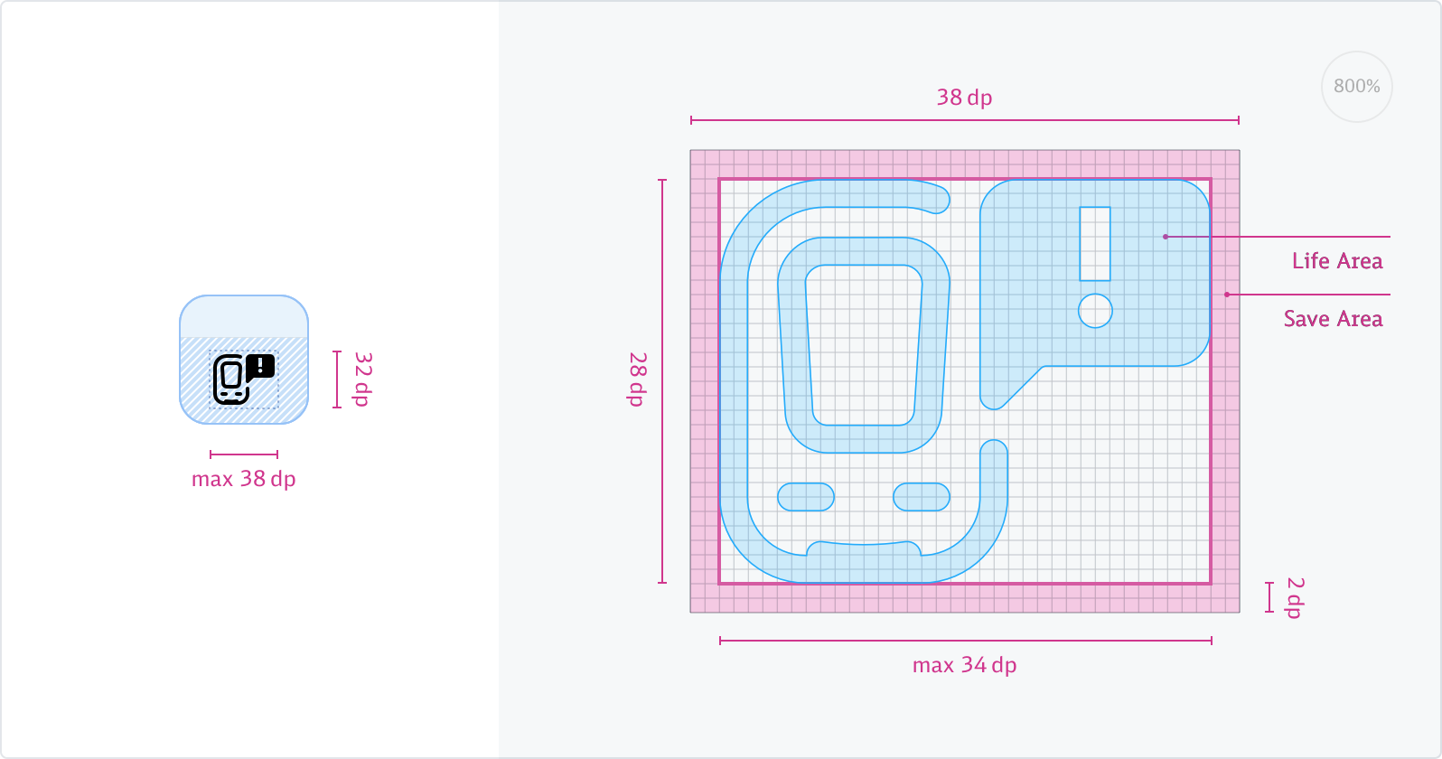 Die Icons werden in Originalgröße in der Vorlage platziert. Wenn die Metapher nicht ausreicht, um die Funktion der App zu erklären, kann das Icon in der Breite erweitert werden – maximal 38dp, inklusive Schutzraum.