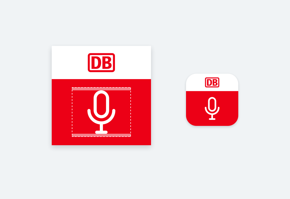 Für eine optimale Darstellung innerhalb der Kreisflächen wird der Abstand nach Innen vergrößert. So gewährleisten wir ausreichend Abstand des DB Logos und des Icons zum Rand des App Icons. Dabei skalieren wir die Grundflächen sowie das Logo und das Icon proportional kleiner.