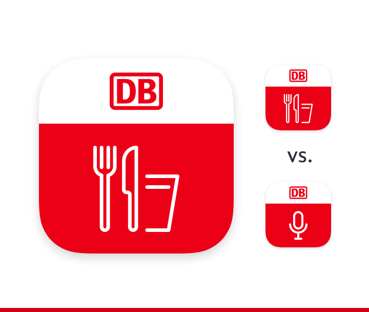Alle weiteren Apps verwenden die 2/3-Regelung. Im oberen Teil wird das DB Logo immer in DB Rot eingesetzt, der untere Teil dient dem Icon, welches die App beschreibt.