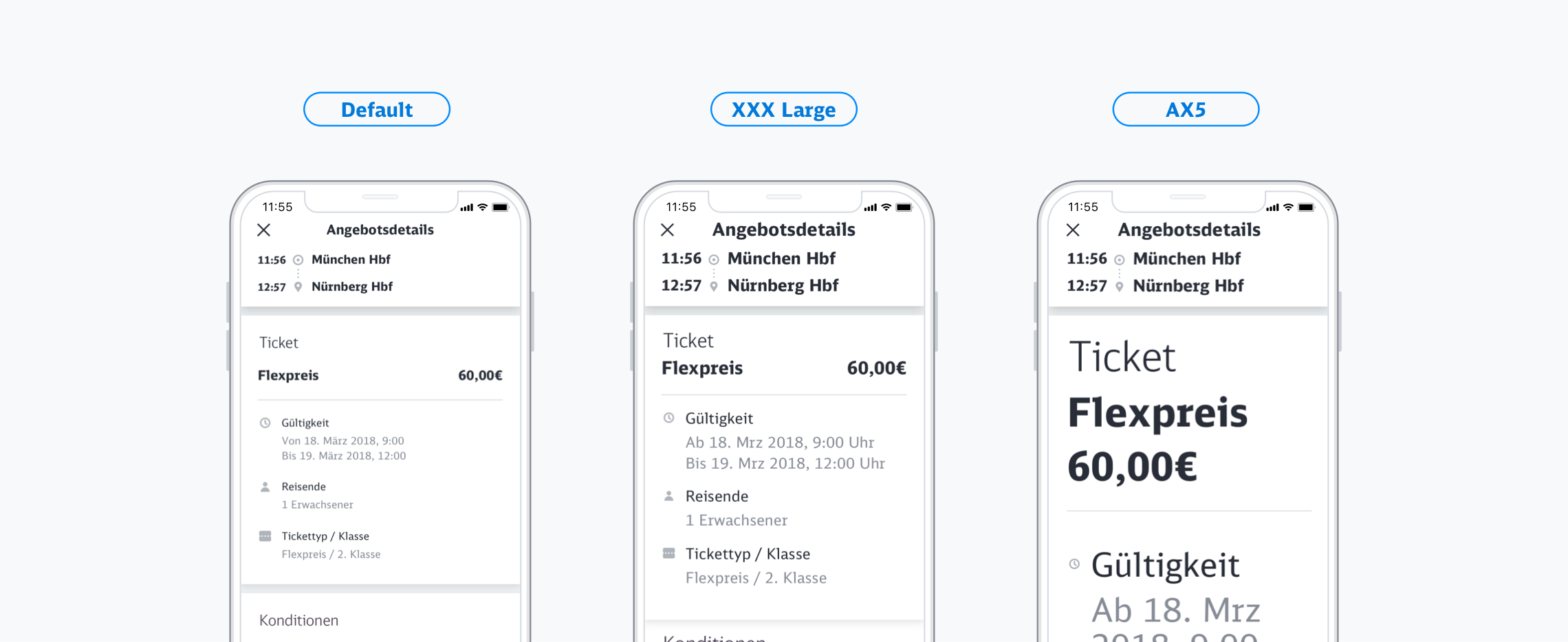 Beispiel: Angebotsdetails in der regulären Größe (Default), Dynamic Type (XXX Large) und Larger Accessibility Type Sizes (AX5).