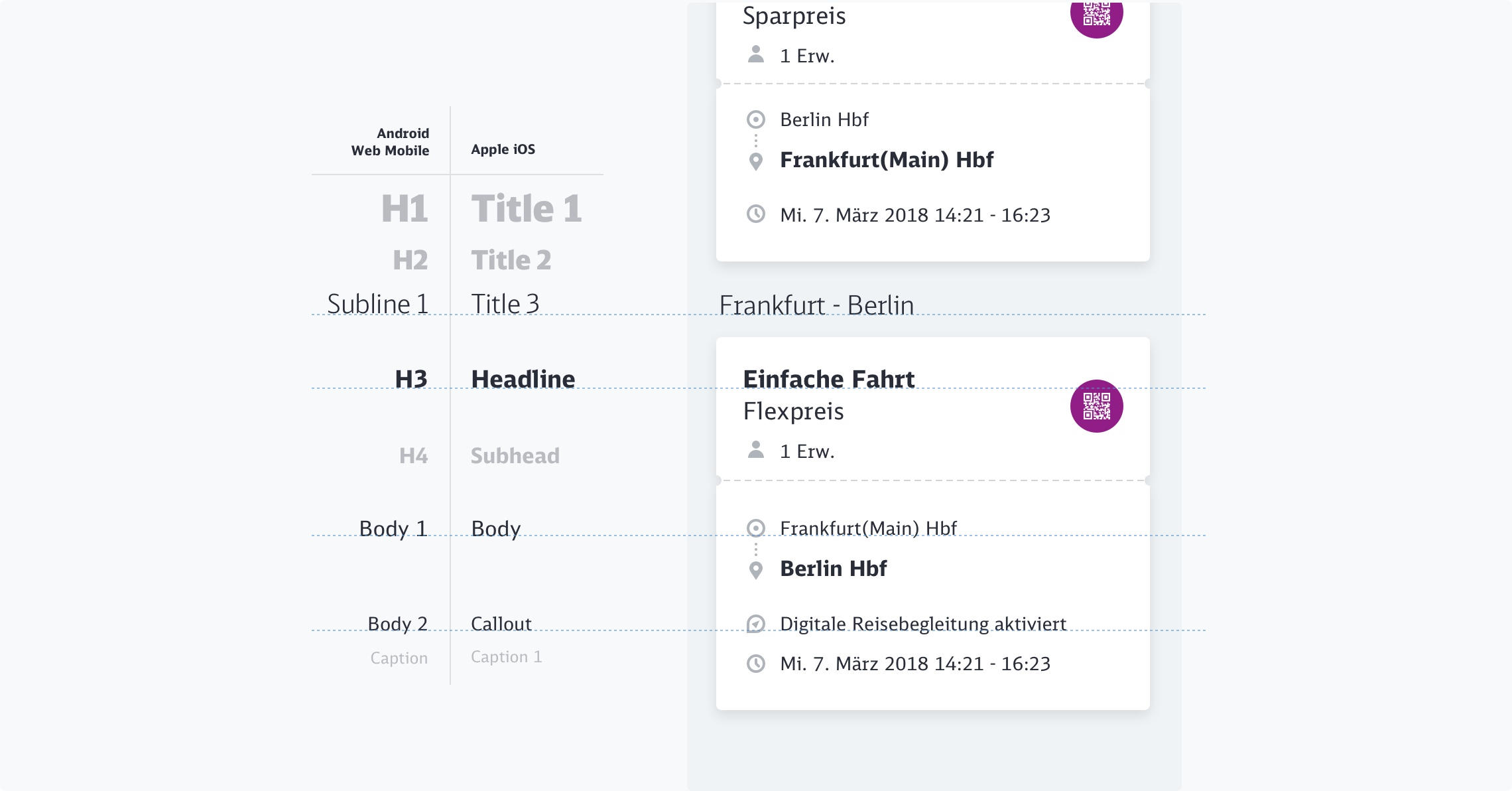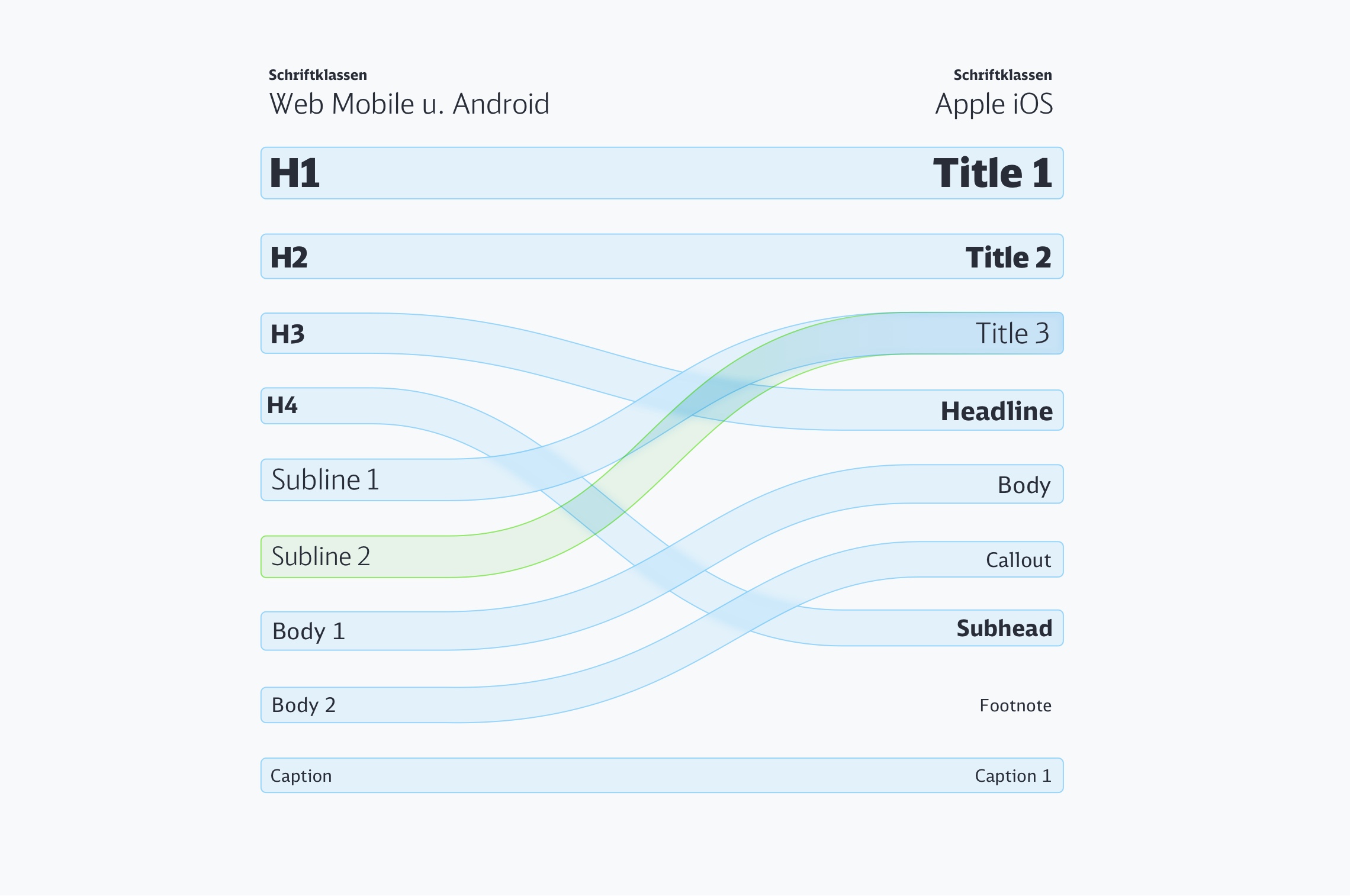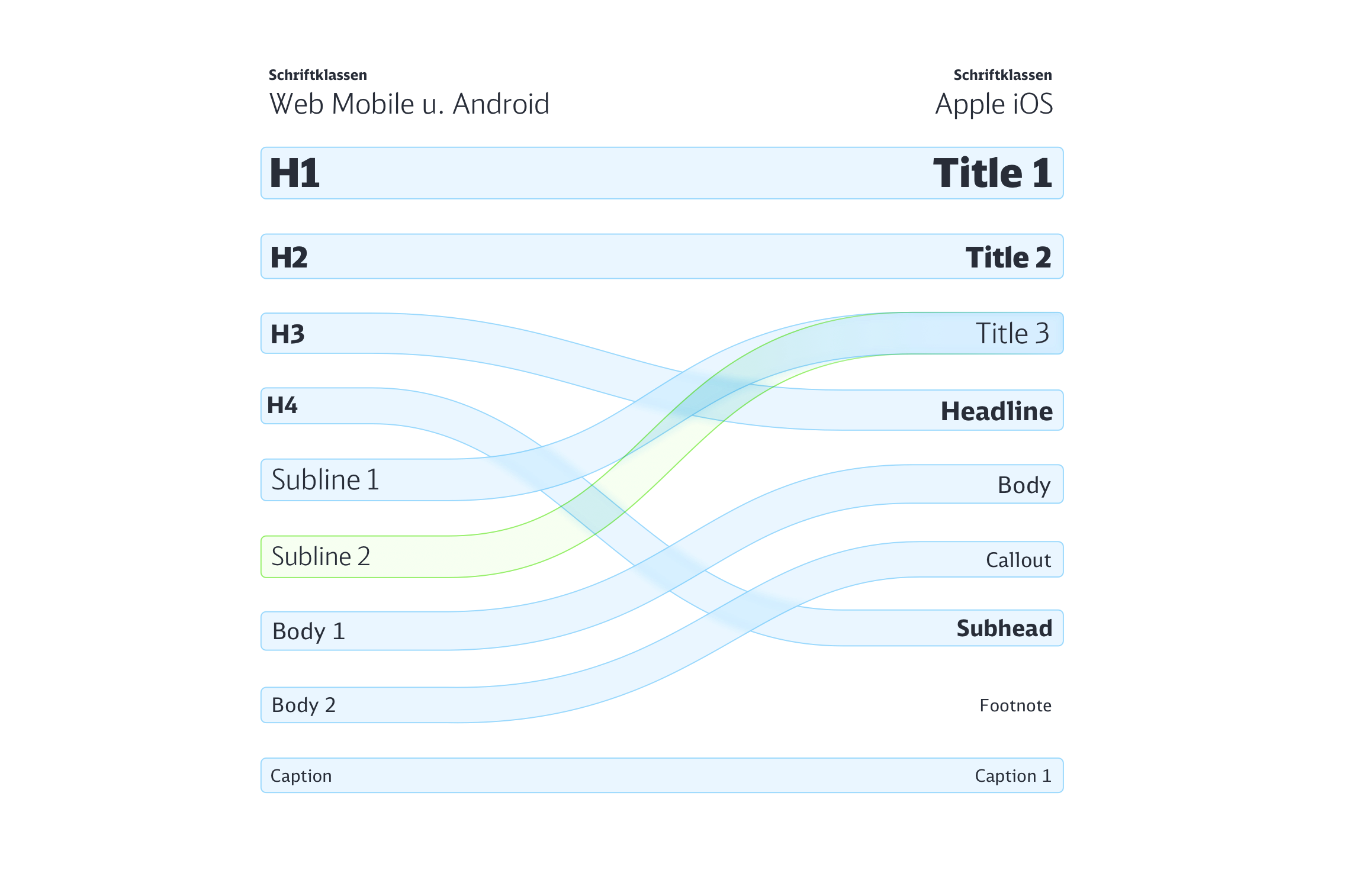 Für die nativen Bestandteile von iOS-Applikationen folgen wir bei der Bezeichnung der Typografie-Klassen den Vorgaben von Apple. Die typografischen Eigenschaften der jeweiligen Schriftklasse folgen unseren Vorgaben und sind kompatibel zu Web Mobile.