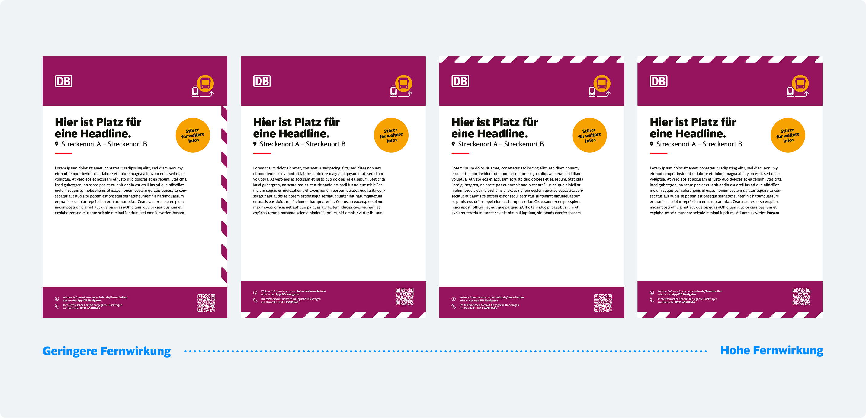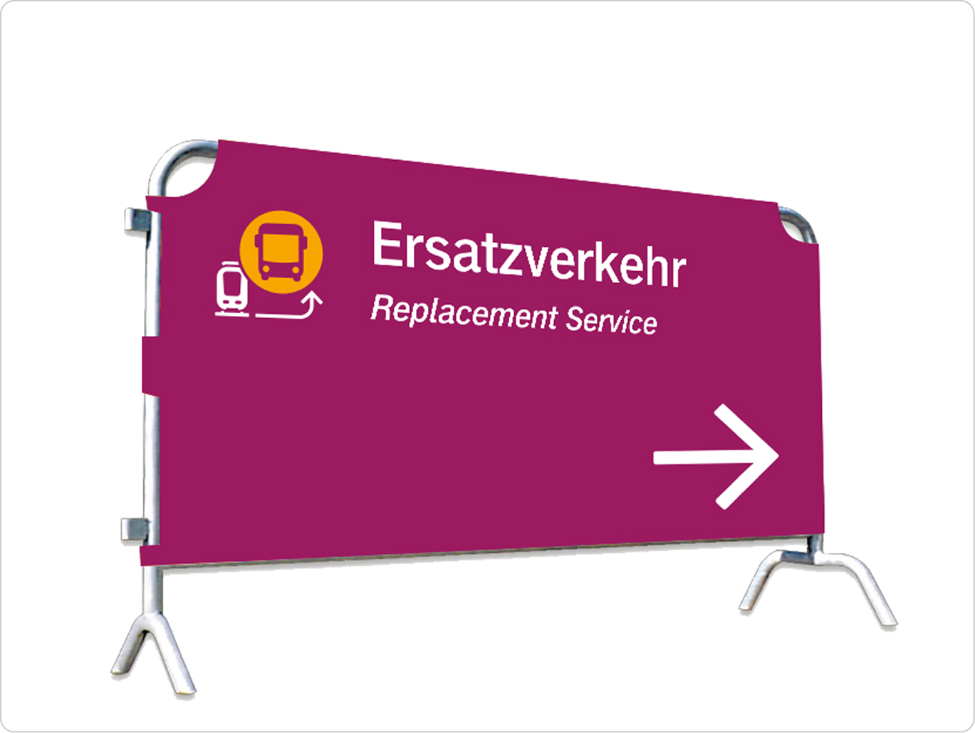 Das markante Flatterband sorgt für Wiedererkennung und Sichtbarkeit in der Kommunikation rund um Baustellen und Ersatzverkehre – es sichert so deren Anschlussfähigkeit. Die abgerundeten Ecken nehmen die Formsprache des Pulses auf und sichern eine einheitliche Erscheinung.