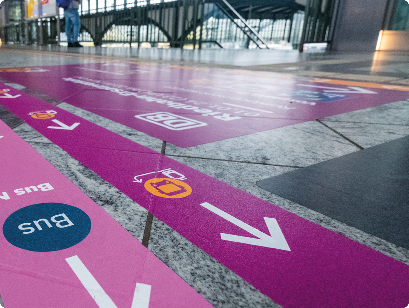 Ein modulares System für Boden- und Wandmarkierungen zeigt den Reisenden den direkten Weg zum Ersatzverkehr. Dabei werden das EV-Piktogramm und die Farbe Verkehrspurpur als wiedererkennbare, erlernte Gestaltungselemente eingesetzt. Die Umgebungspläne in Vitrinen an den Stationen unterstützen dabei.