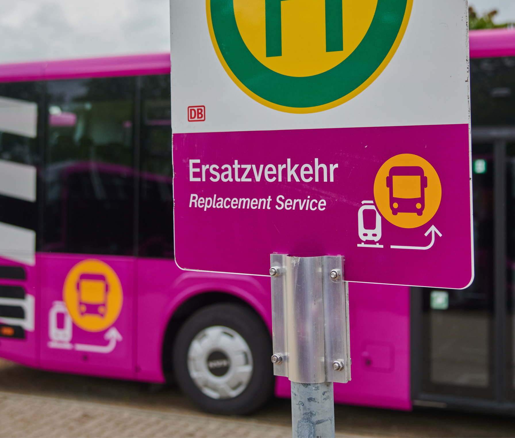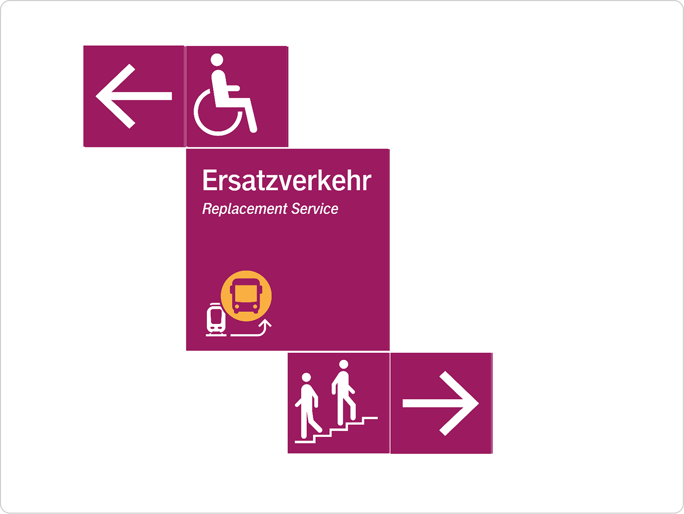 Das Ersatzverkehrs-Piktogramm ist das zentrales Element des Ersatzverkehrsdesigns. Es hilft Fahrgästen, den Ersatzverkehr zuverlässig zu erkennen – an Bahnhöfen, auf Fahrzeugen und in der Wegeführung. Das Piktogramm wurde im Rahmen von einer Marktforschung getestet und bietet eine hohe Sichtbarkeit. Das EV-Piktogramm kann auch von externen Betreibern verwendet werden. Es liegt grundsätzlich im Verantwortungsbereich der DB InfraGO im Fachbereich Personenbahnhöfe. Für einen konsistenten Einsatz steht das Piktogramm für digitale und analoge Anwendungen entsprechend zur Verfügung.