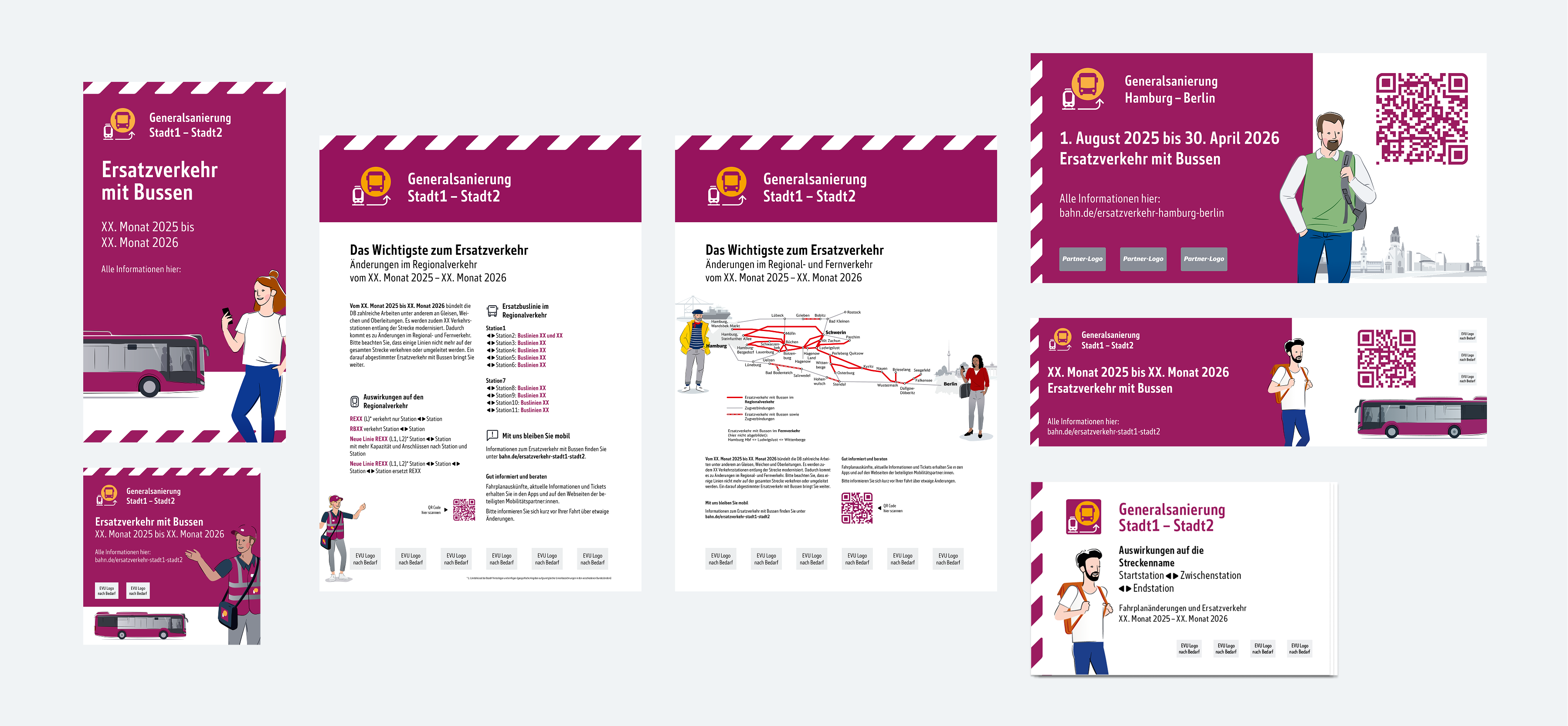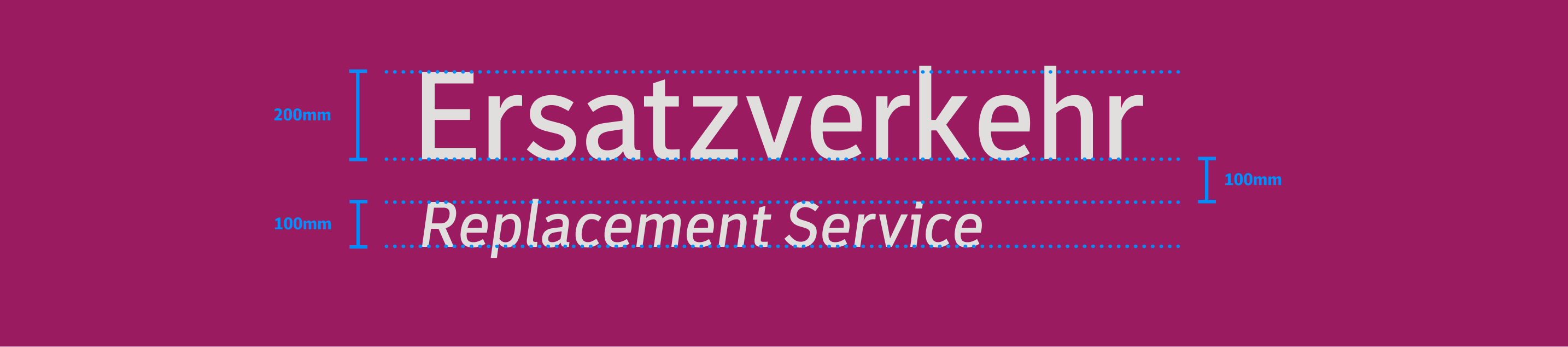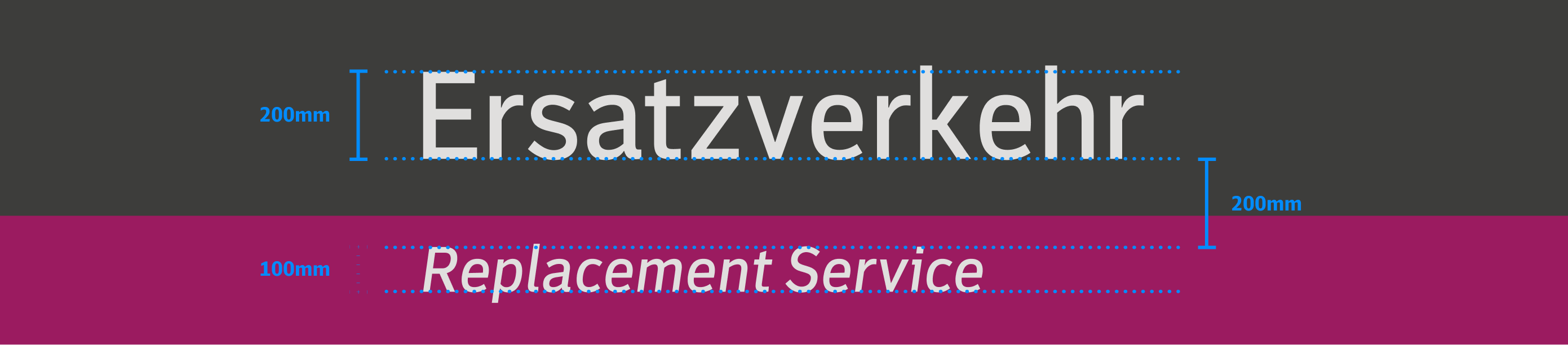 Die spezifischen Gestaltungsmerkmale, wie Verkehrspurpur, Illustrationen und das Ersatzverkehr-Piktogramm sorgen weiterhin für eine eindeutige Wiedererkennung und bleiben erhalten. Statt der DB Neo wird jedoch die Schriftart Monitor verwendet, um eine Neutralität zu sichern.