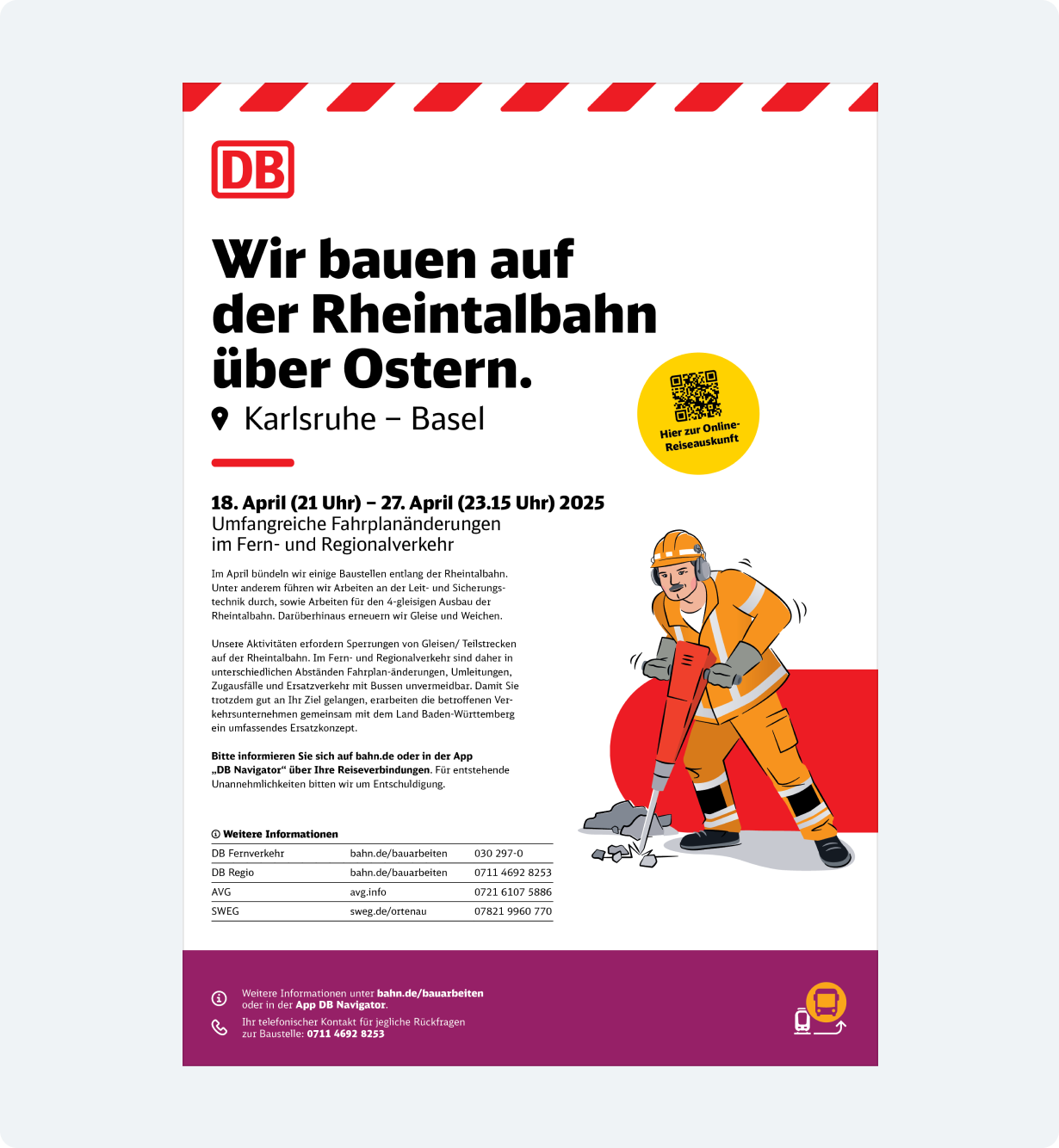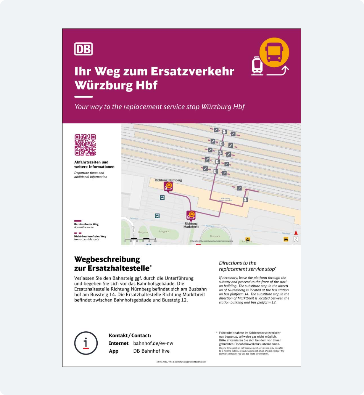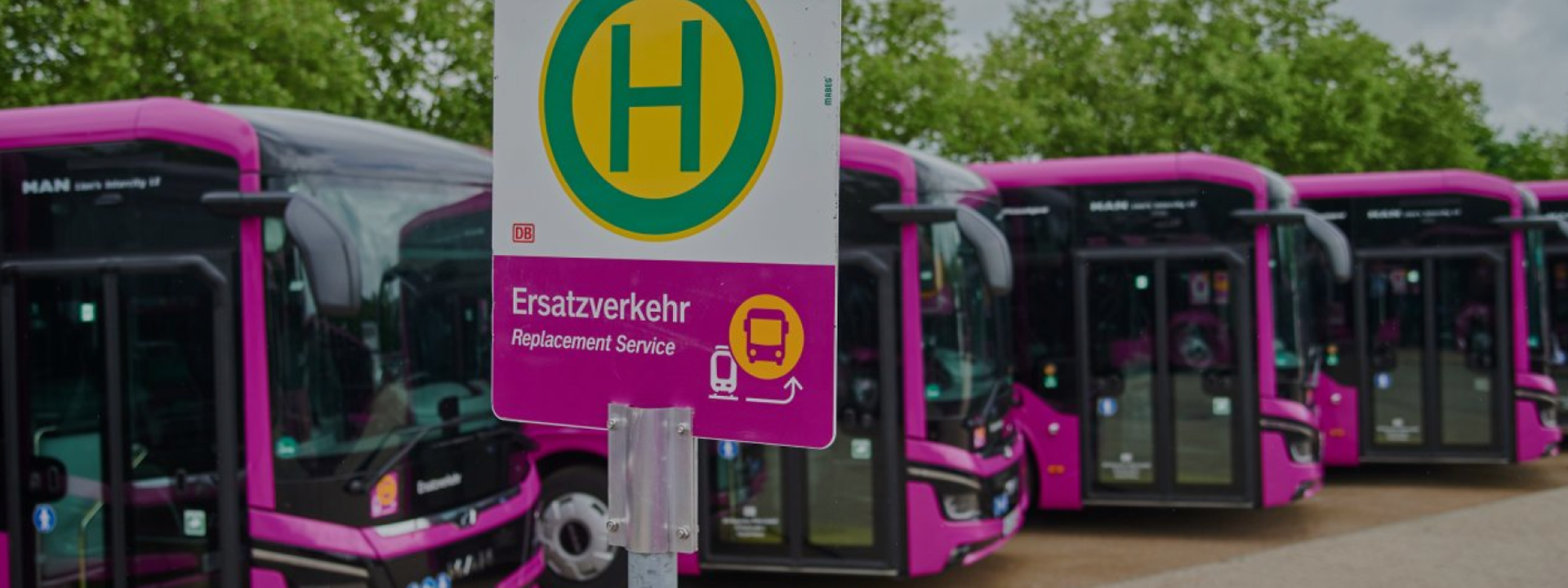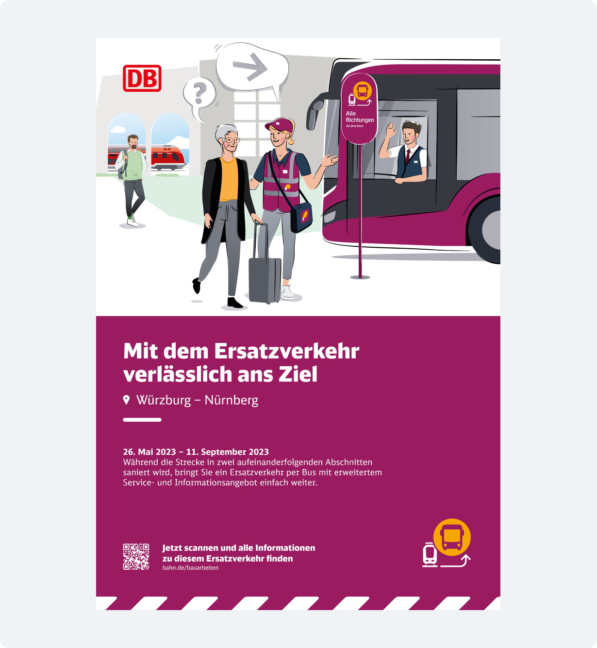 Die spezifischen Gestaltungsmerkmale, wie Verkehrspurpur, Illustrationen und das Ersatzverkehr-Piktogramm sorgen weiterhin für eine eindeutige Wiedererkennung und bleiben erhalten. Statt der DB Neo wird jedoch die Schriftart Monitor verwendet, um eine Neutralität zu sichern.