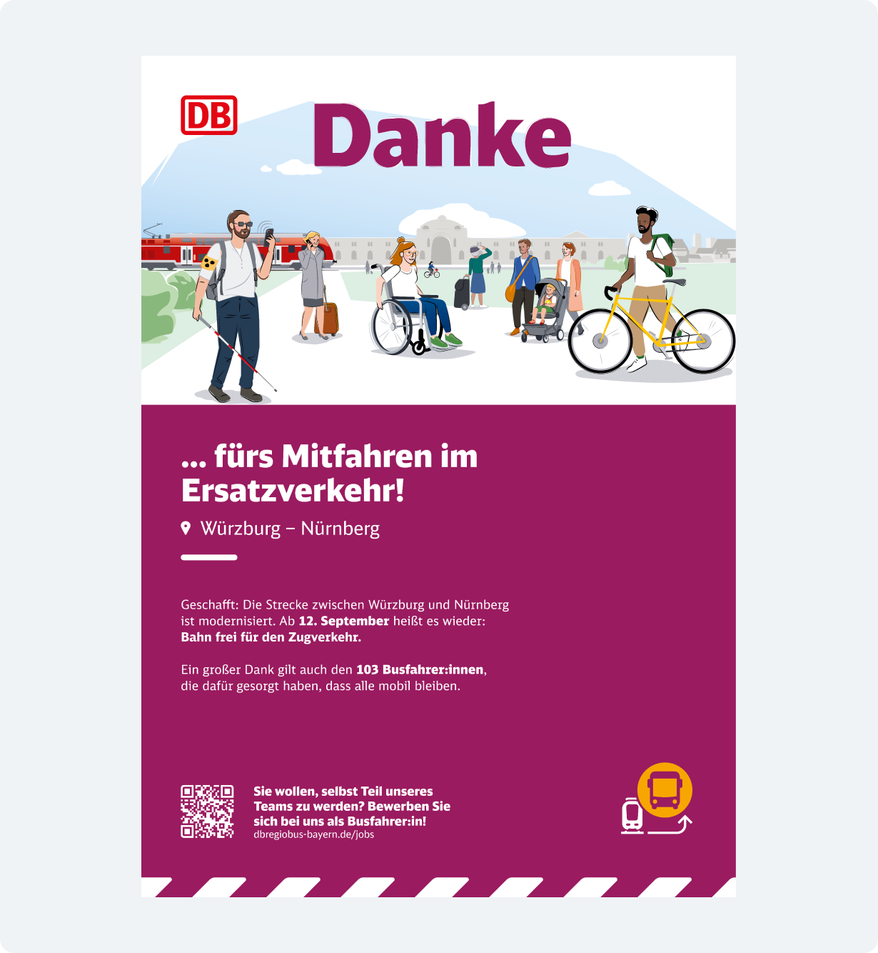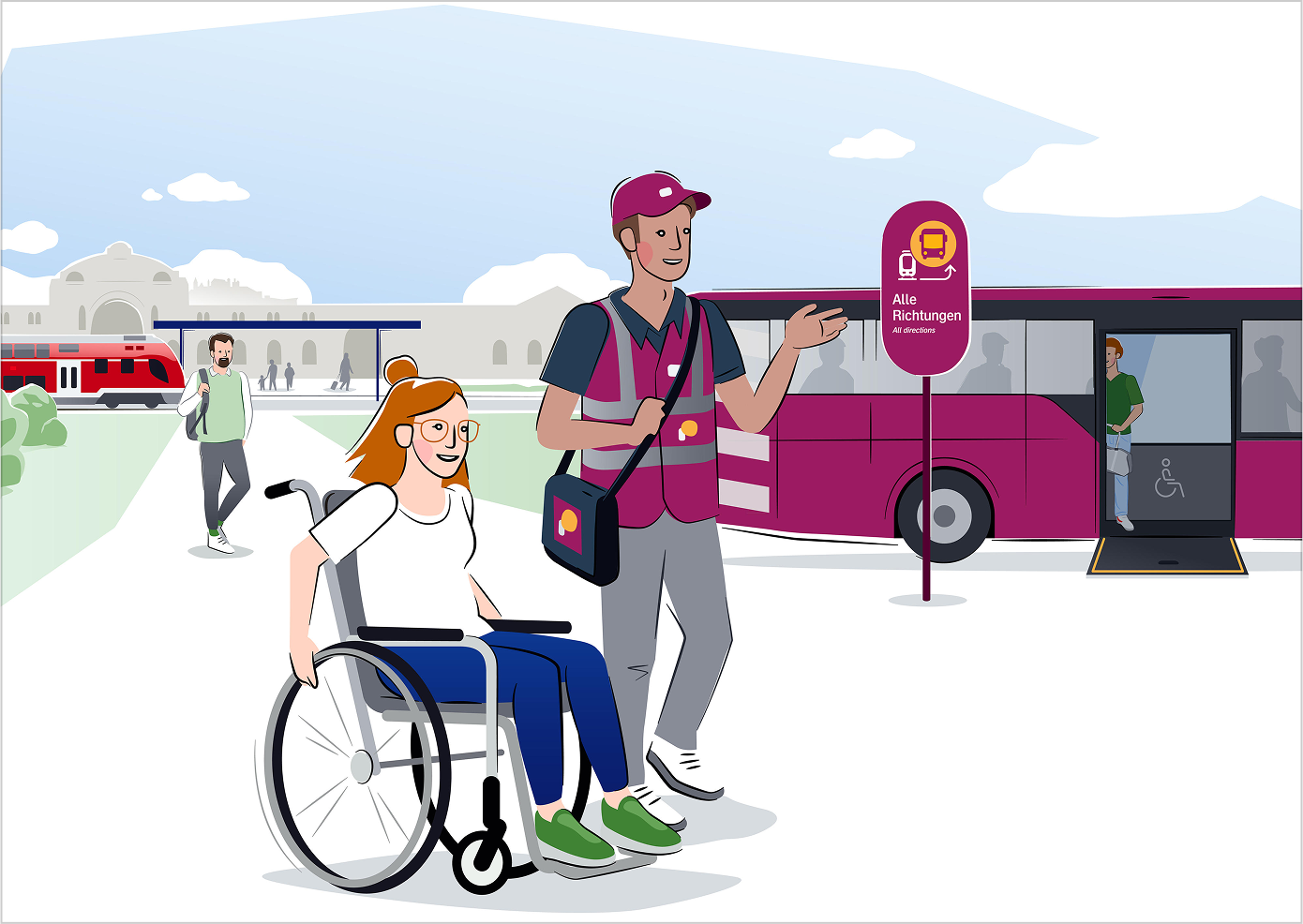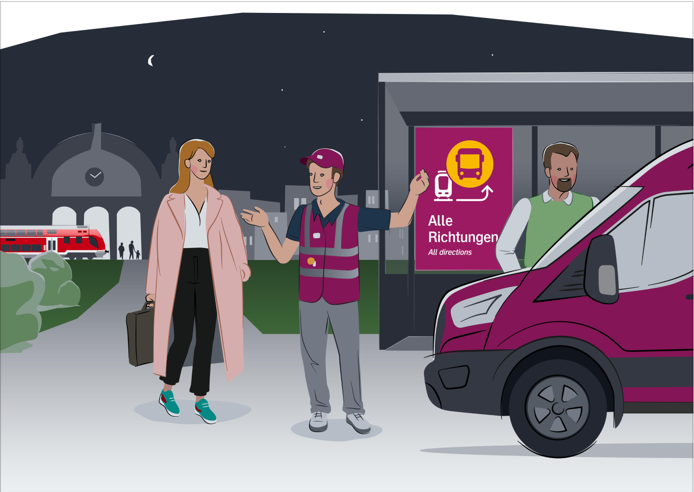 Die Illustrationen machen den Ersatzverkehr leichter zugänglich und verständlich. Sie sind im definierten Illustrationsstil der Deutschen Bahn gestaltet und veranschaulichen bildhaft die verschiedenen Angebote für Fahrgäste. So wird wichtige Information schneller erfasst und Sprachbarrieren überbrückt.