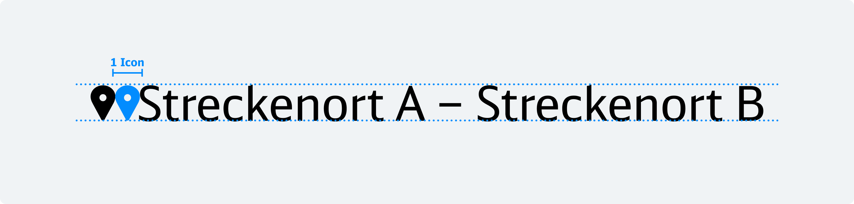 Um die betroffene Strecke in den Kommunikationsmitteln eindeutig sichtbar zu machen, wird sie gezielt hervorgehoben – bei Bedarf auch nur Einzelpunkte. Die Schriftgröße beträgt 60 % der Headline und wird durch ein Stecknadel-Icon (Destination – Solid 24dp) eingeleitet. Das Icon entspricht der Versalhöhe, hat die Schriftfarbe und einen festen Abstand zum Text. Start- und Zielpunkt werden durch einen Gedankenstrich mit Leerzeichen getrennt. Die Strecken-Darstellung wird in DB Neo Head Regular geschrieben und und wird abhängig vom Hintergrund in Schwarz oder Weiß eingefärbt.