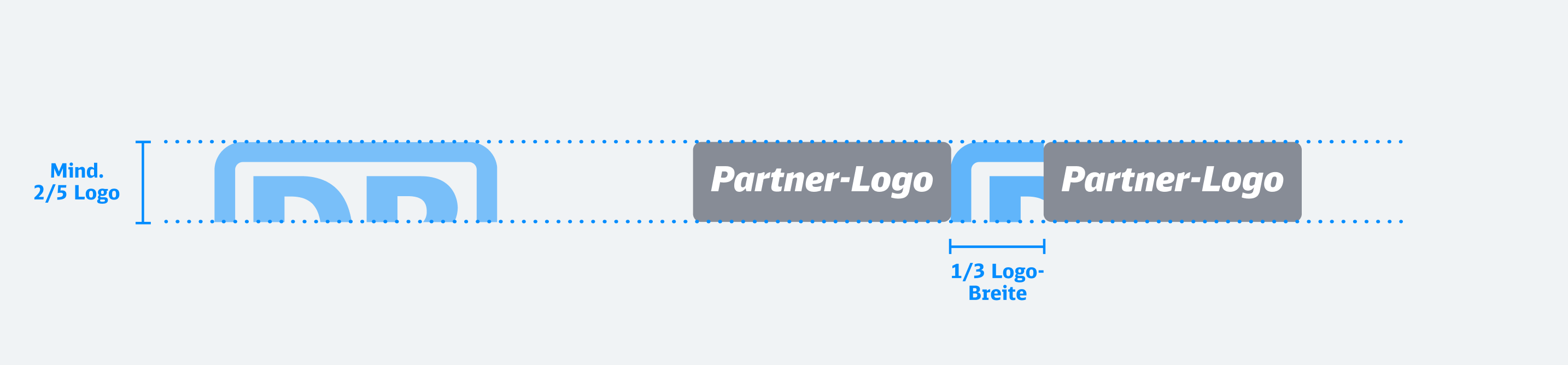 Partner-Logos werden am unteren Rand des Layouts platziert. Sie dürfen mindestens 2/5 der Größe des DB-Logos haben und müssen mindestens ein Drittel Abstand zueinander einhalten. Die Logos werden nur auf weißem Hintergrund verwendet und dürfen niemals größer als das DB-Logo sein. Auf Verkehrspurpur ist das Logo ausschließlich in Weiß (negativer Version) darzustellen. Die Richtlinien der Partner sind zu berücksichtigen.