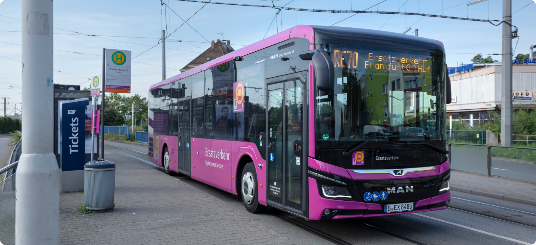 Das Ersatzverkehrs-Piktogramm sorgt für eine klare Wiedererkennbarkeit und wird daher gut sichtbar auch auf den Fahrzeugen platziert – an den Seitenflächen, am Heck, an der Front sowie in Augenhöhe an den Einstiegen.