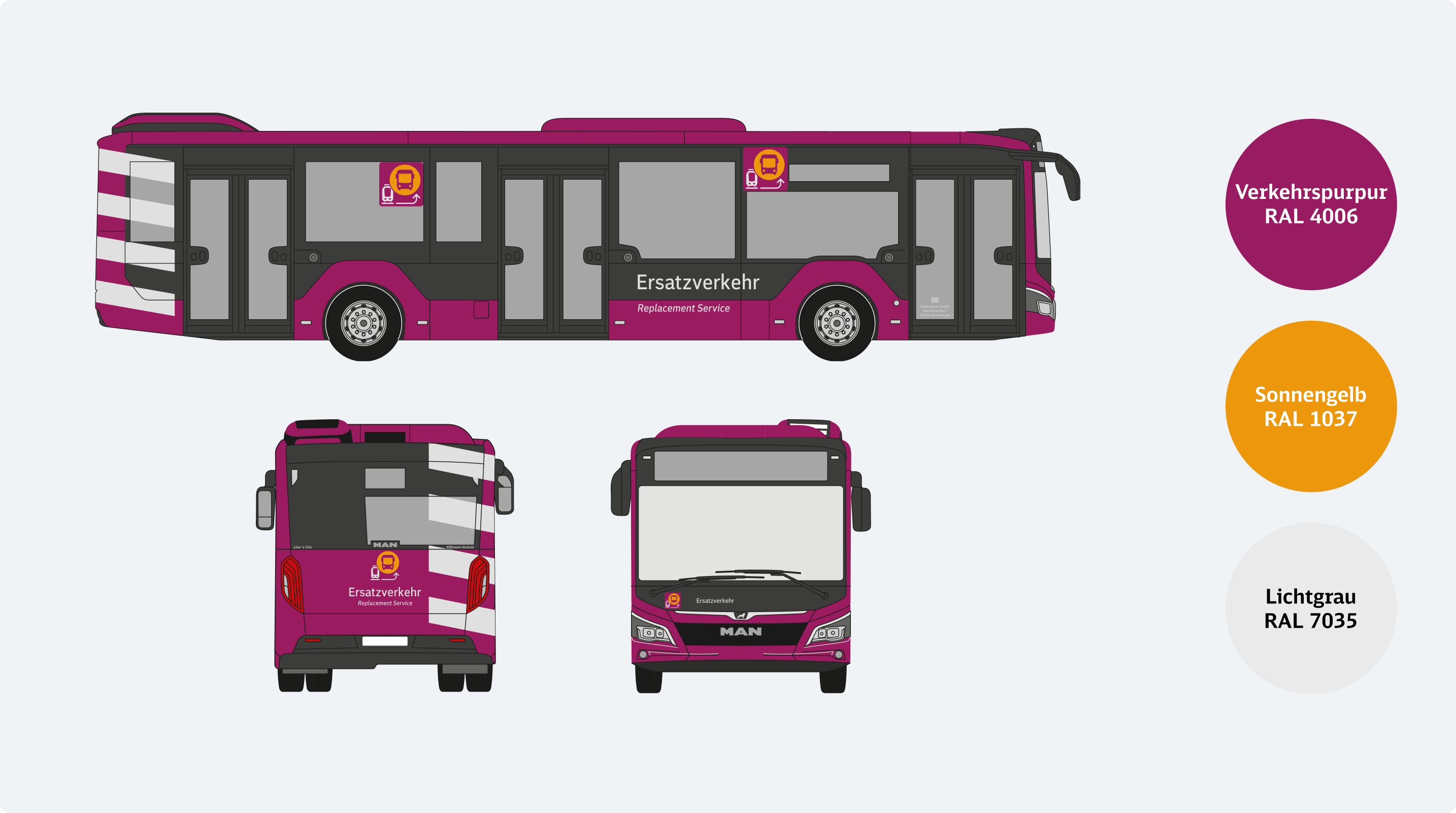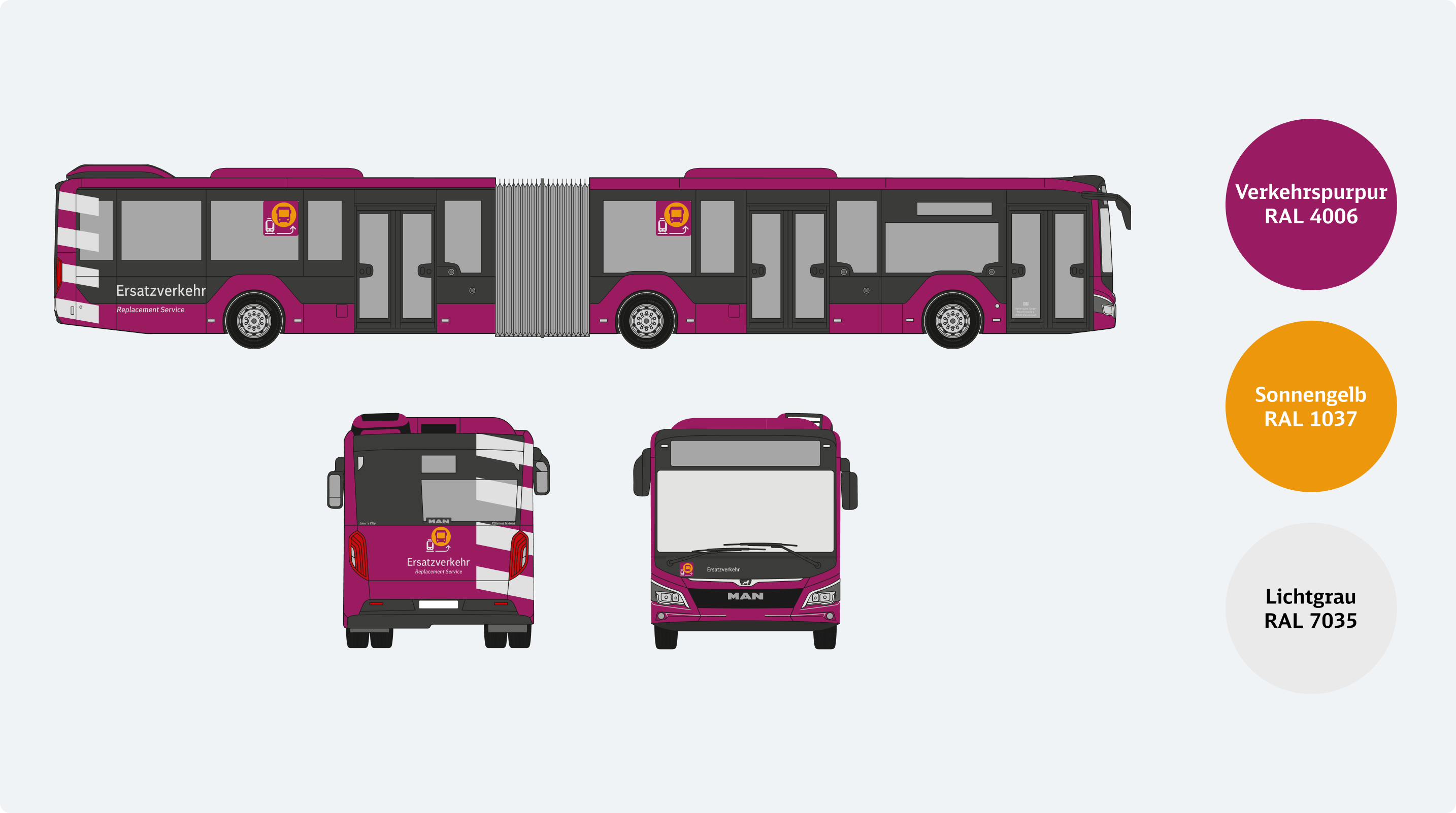 Die Busse sind in Verkehrspurpur lackiert. Das EV-Piktogramm sowie die Beschriftung „Ersatzverkehr” bzw. „Replacement Service“ erscheinen in Lichtgrau (RAL 7035). Lichtgraue Streifen am Heck runden das Fahrzeugbranding ab.