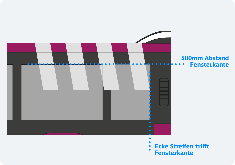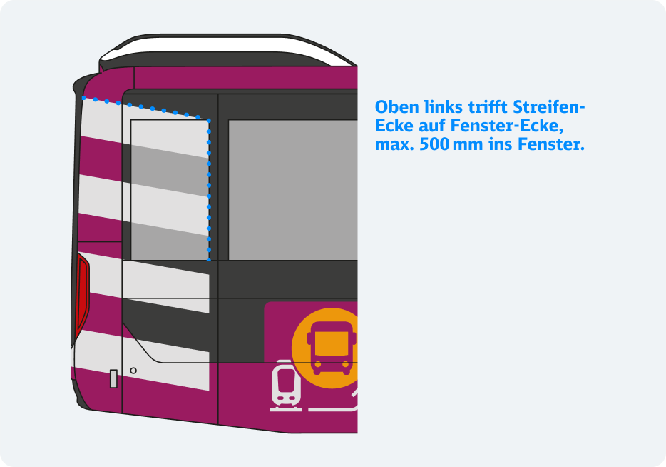 Die Streifen auf den Ersatzverkehrs-Fahrzeugen erhöhen die Fernwirkungen und tragen zur Wiedererkennung bei. Die einzelnen Streifen werden von der Seite über Eck bis zum Heck in einem Stück foliert. Die Streifen auf der linken Seite werden nur im oberen Bereich bis ins Fenster positioniert.
