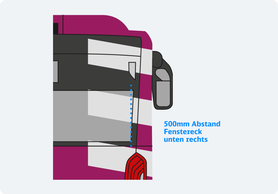 Zentriert auf dem linken Fenster der ersten Einstiegstür mit dem Ankerpunkt: Unterkante Schrift bündig zur Unterkante Seitenblinker