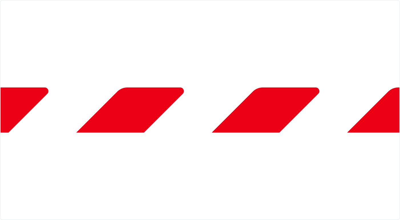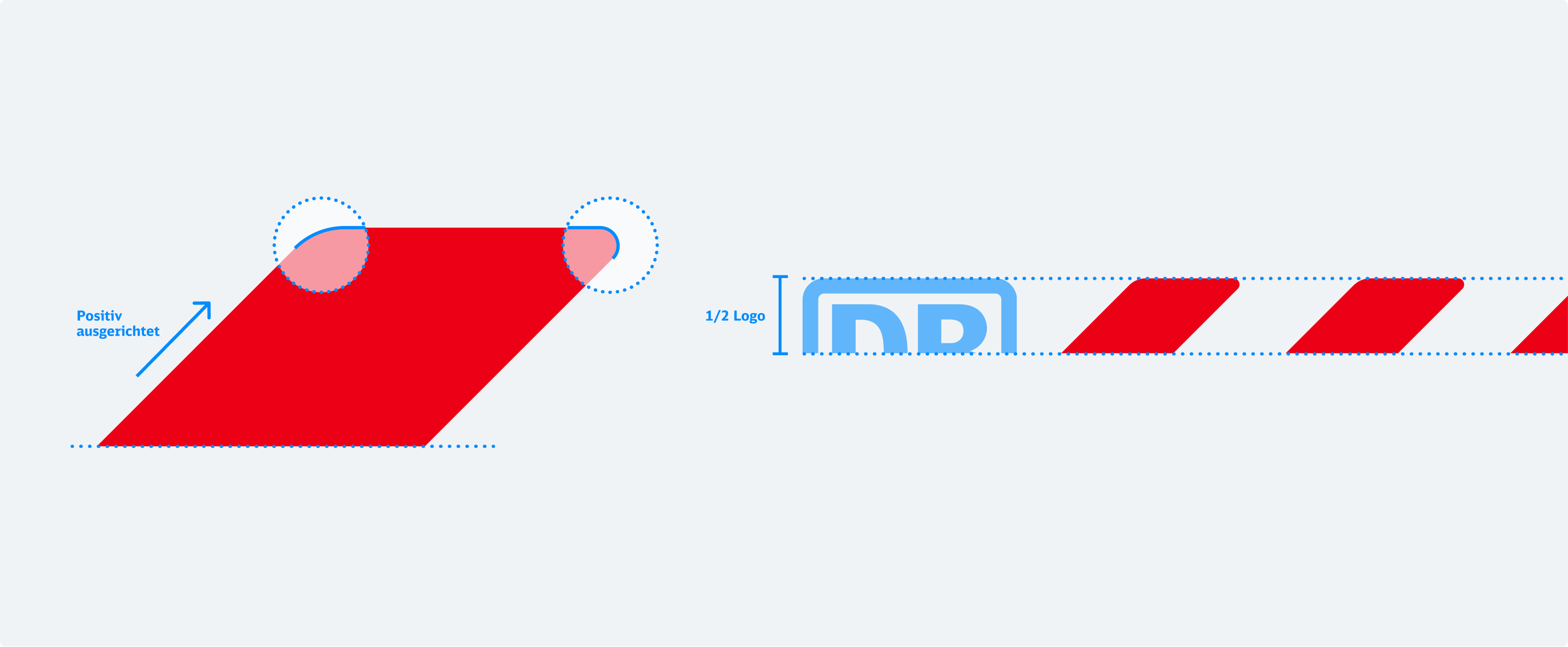 Mit seinen abgerundeten Seiten spiegelt das Flatterband die Formsprache des Pulses wider. Das Flatterband wird mit einer einseitig scharfen Kante entlang der Formatgrenze positioniert. Es steigt in jeder Anwendung stets positiv, dynamisch nach rechts oben und misst in der Höhe die Hälfte des DB-Logos. Für freistehende Platzierungen steht eine beidseitig abgerundete Variante zur Verfügung.