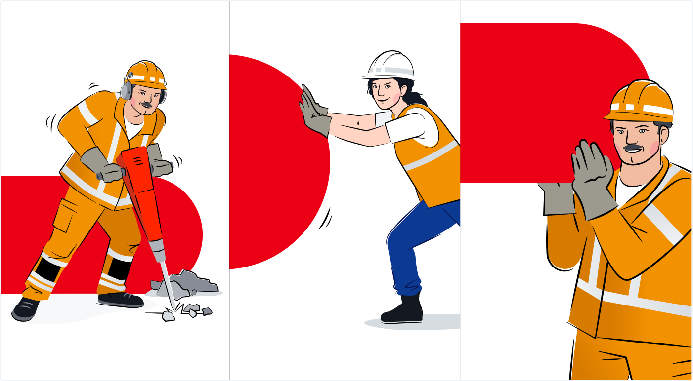 In der Baukommunikation kommen fest definierte Illustrationen zum Einsatz, die den Baustellenbezug verdeutlichen. Sie erhöhen die Verständlichkeit des Themas und verdeutlichen die anpackende Atmosphäre mit deutlich positivem Veränderungswillen. Heinz, Enza, Maulwurf sowie andere Baustellen-Charaktere sind tatkräftig bei der Arbeit und interagieren mit dem großen Puls oder der Typografie. Achtung: Der Einsatz von Bildmotiven und Illustrationen im Kombination sollte vermieden werden. Für weitere Accessoires oder Illustrationen gelten die Regeln der Illustrationen.