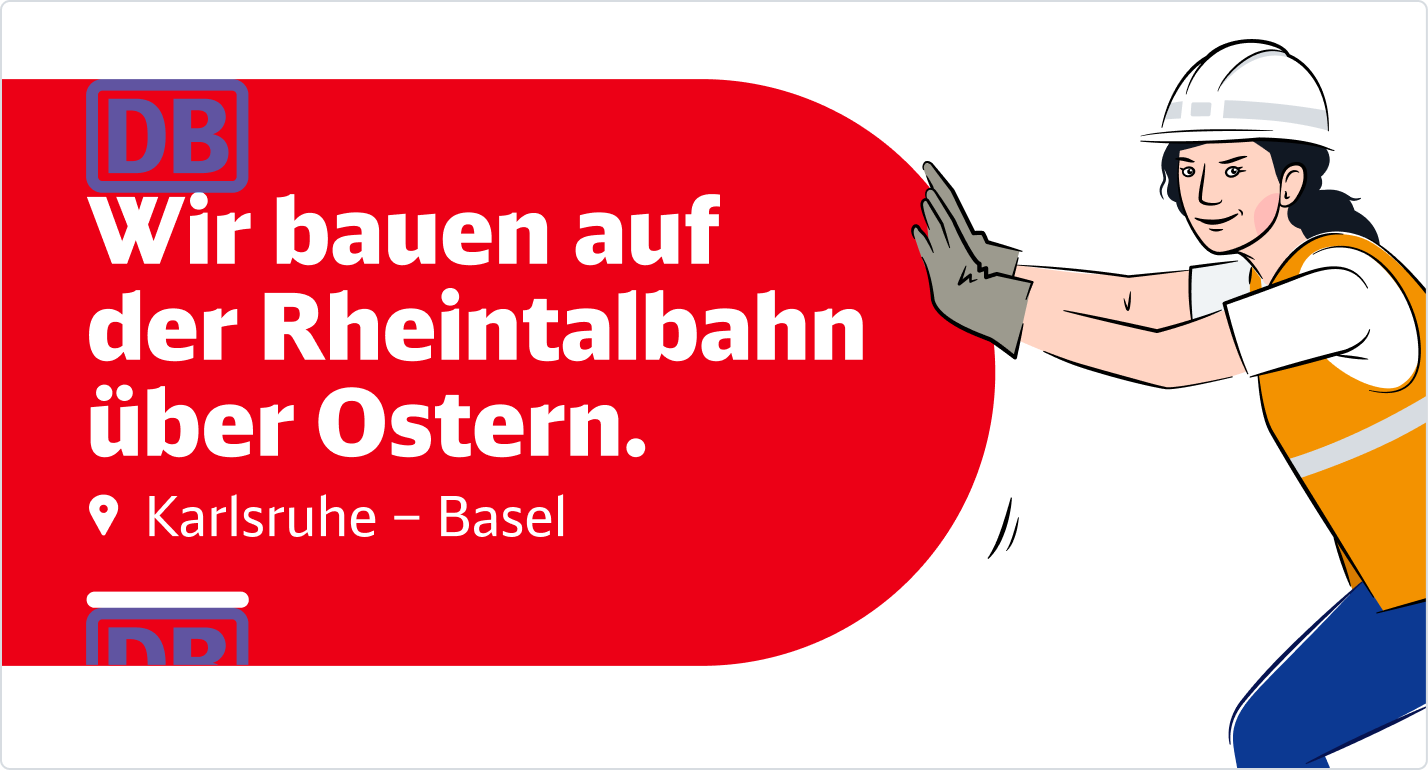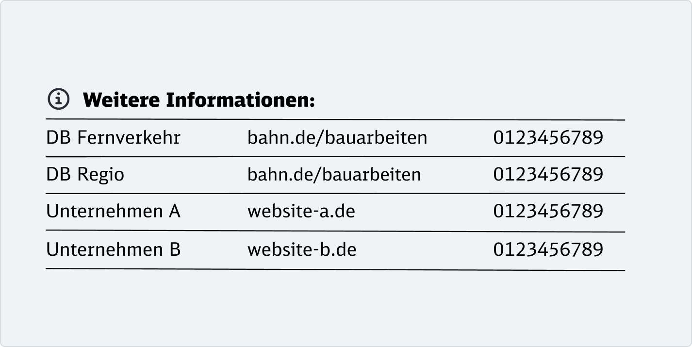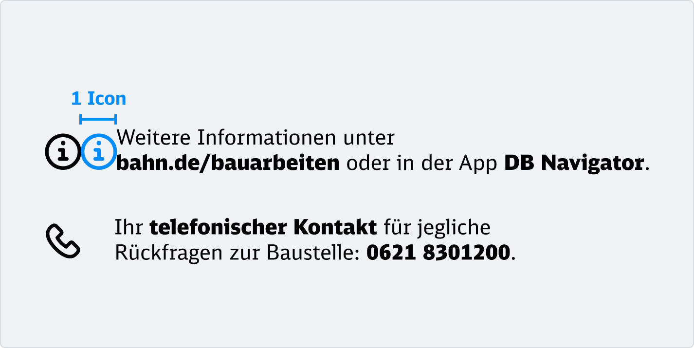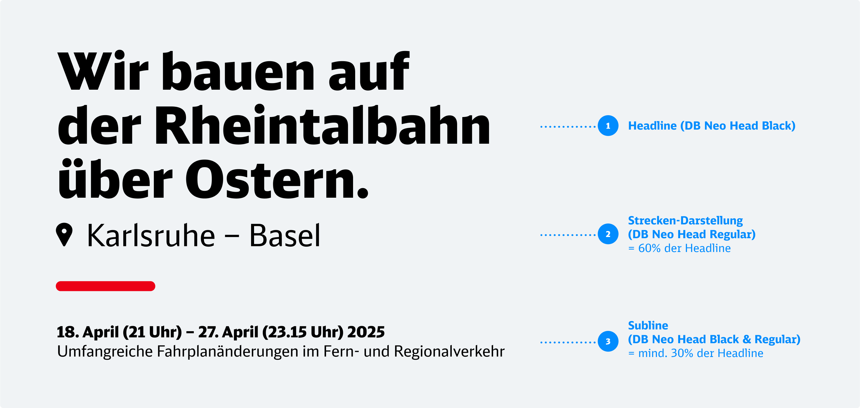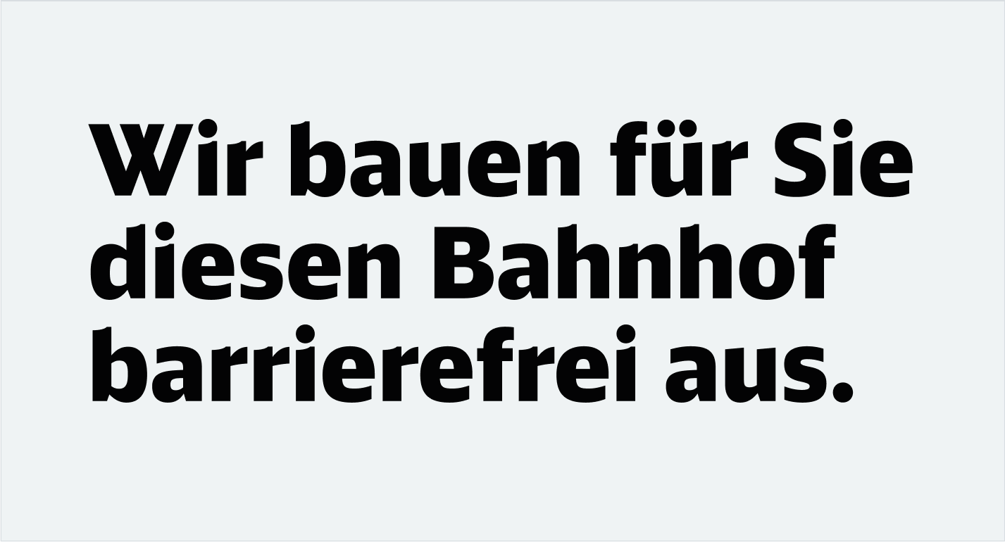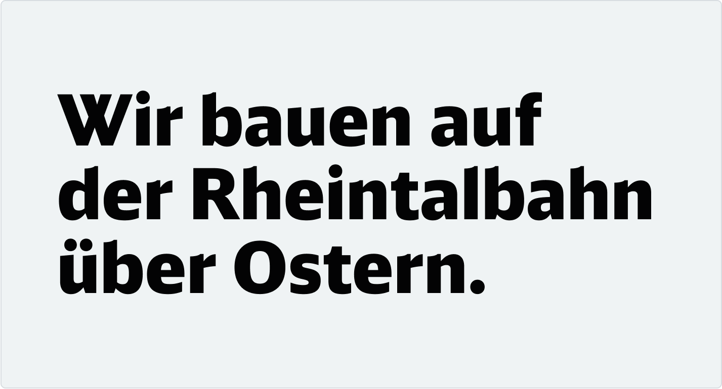 Die Headline bildet die erste inhaltliche Ebene. Sie vermittelt klar und verständlich zentrale Infos zur Baumaßnahme – funktional, informierend oder aktivierend, emotionaler in der Ansprache. Ortsangaben sollten hier vermieden werden, um Dopplungen zu verhindern.Sie wird in DB Neo Head Black geschrieben.