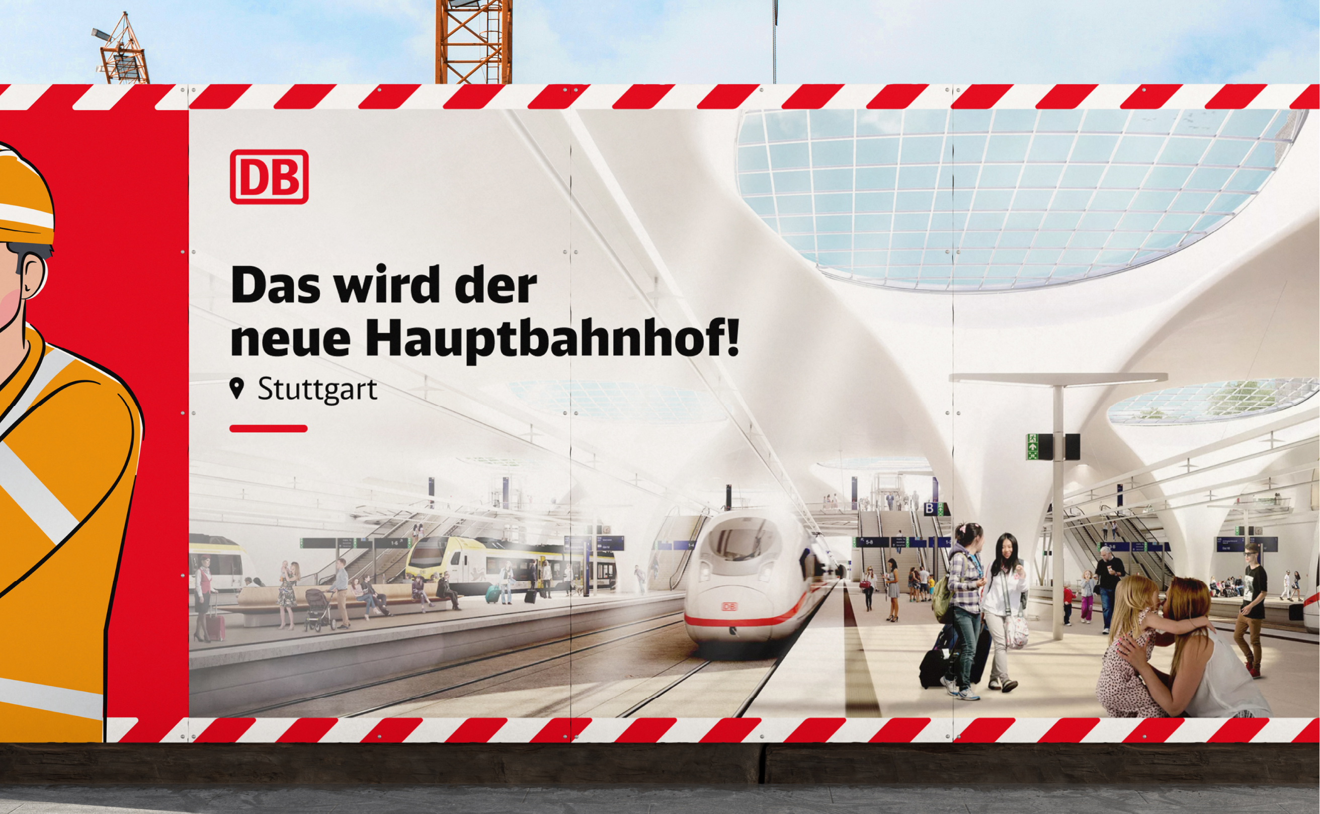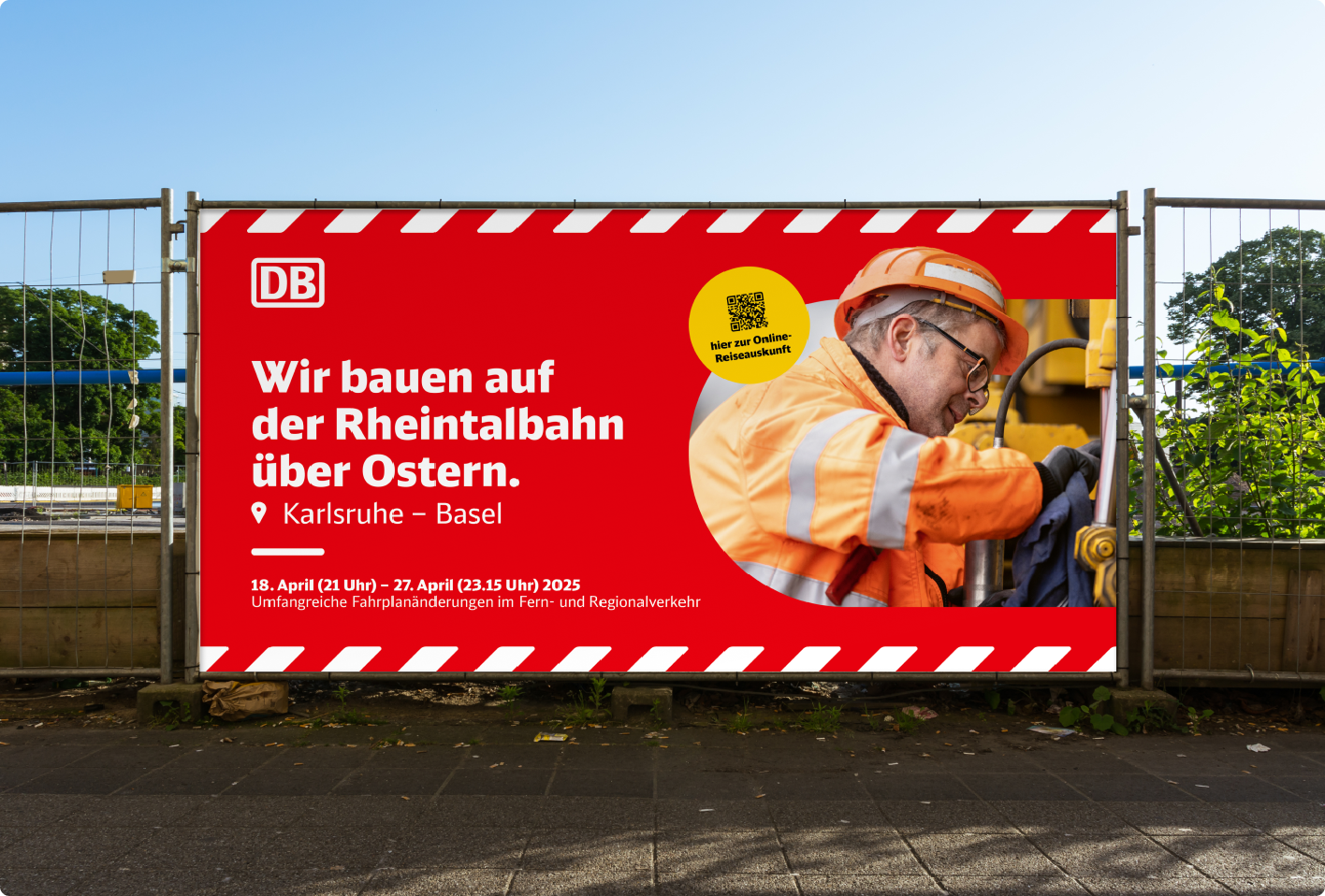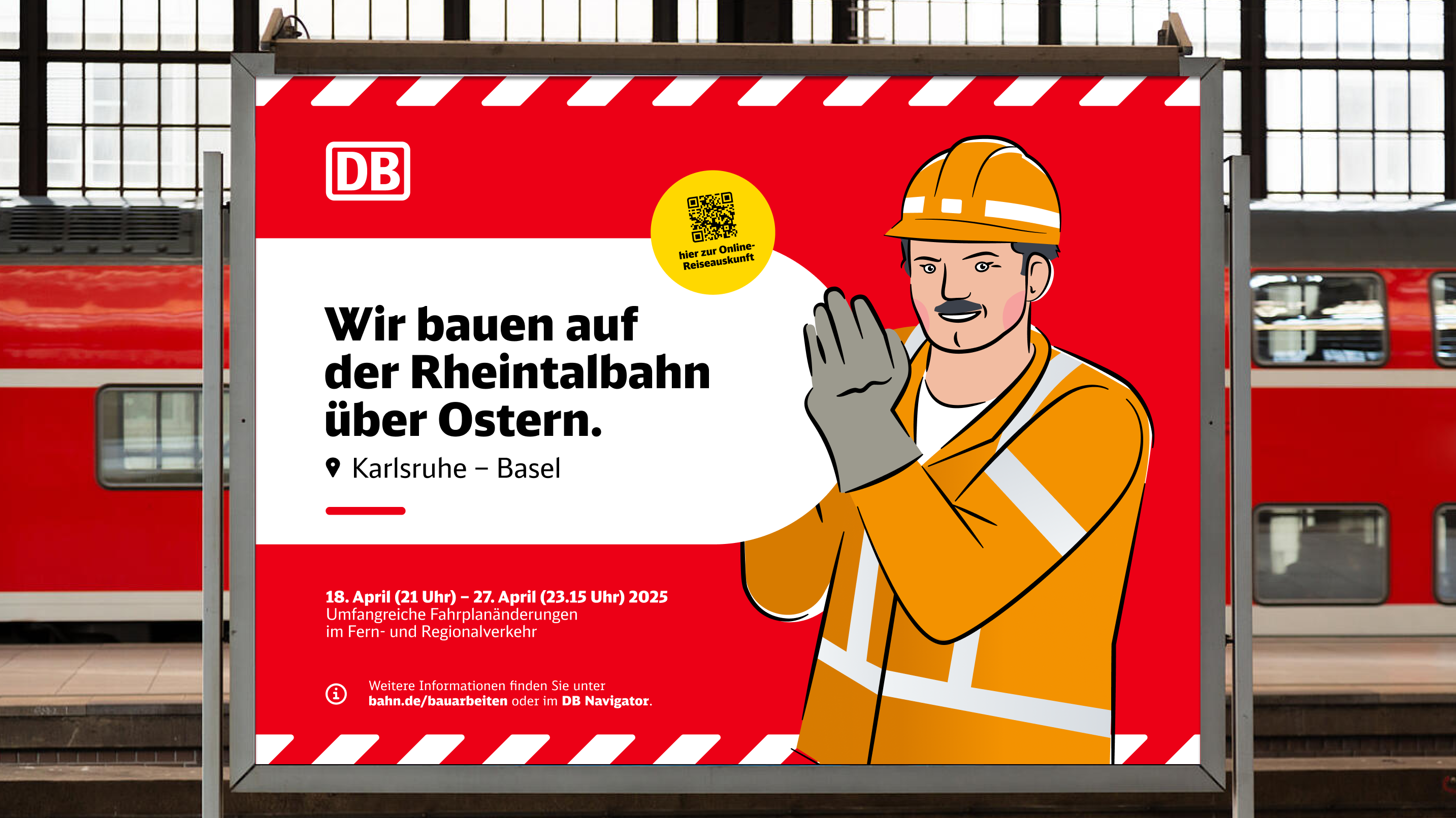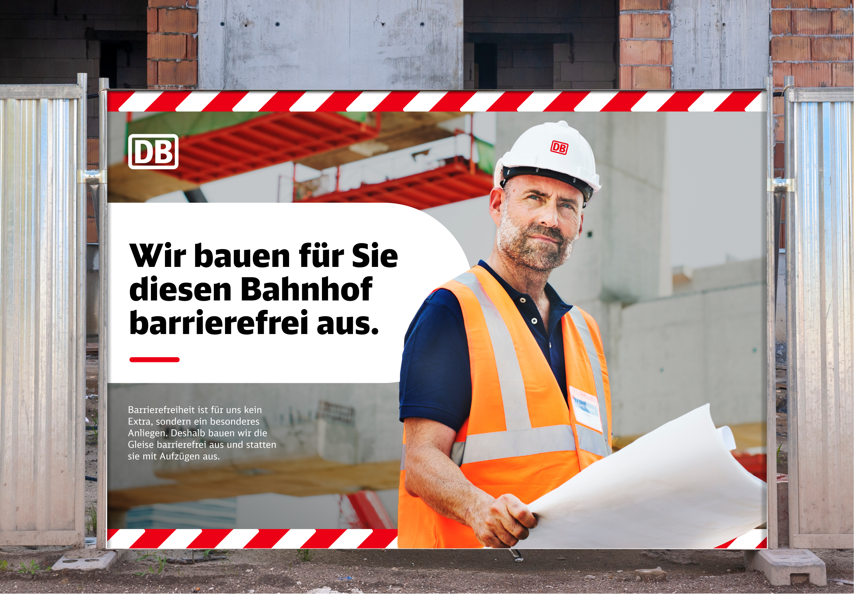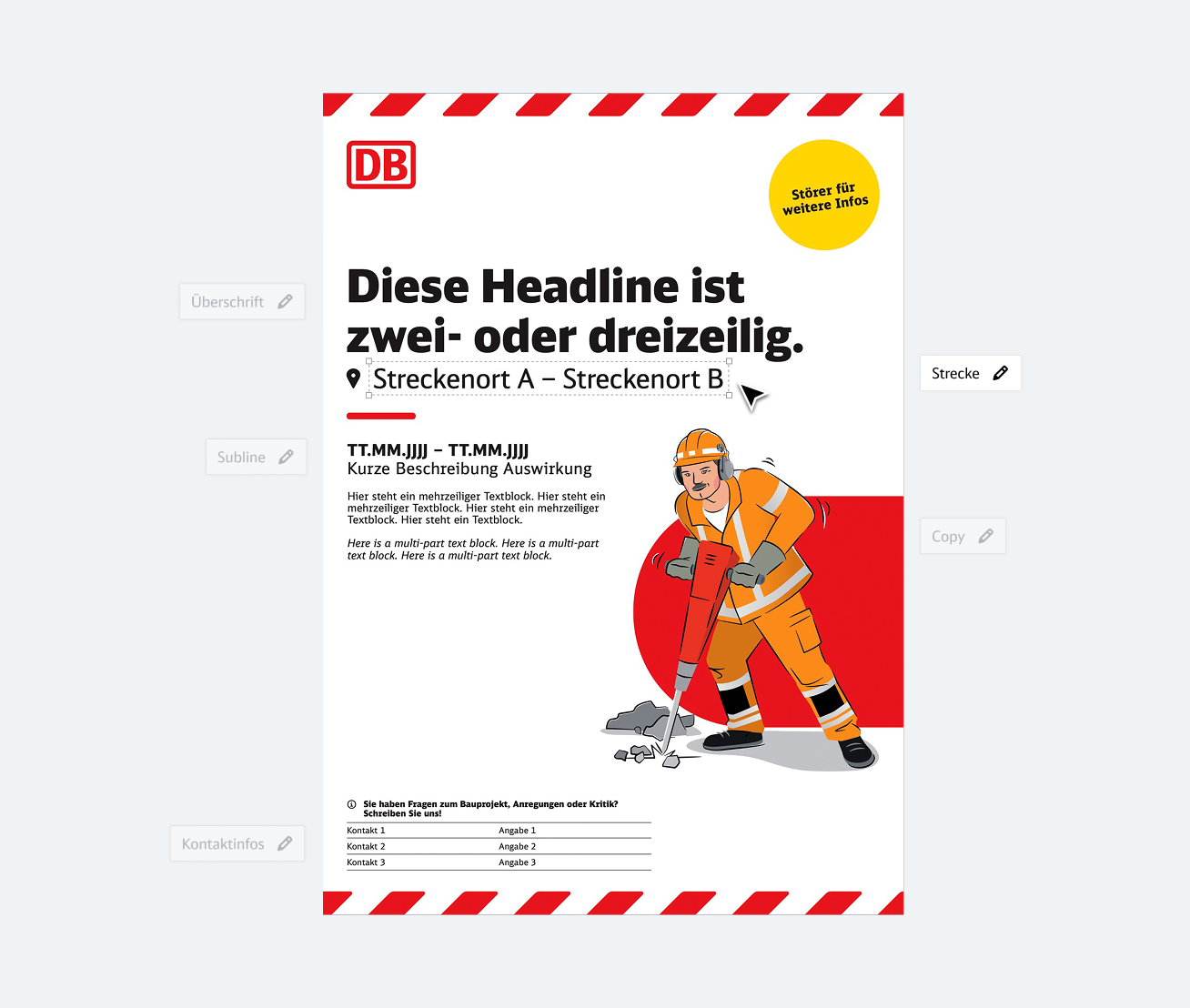 Die Headline bildet die erste inhaltliche Ebene. Sie vermittelt klar und verständlich zentrale Infos zur Baumaßnahme – funktional, informierend oder aktivierend, emotionaler in der Ansprache. Ortsangaben sollten hier vermieden werden, um Dopplungen zu verhindern.Sie wird in DB Neo Head Black geschrieben.