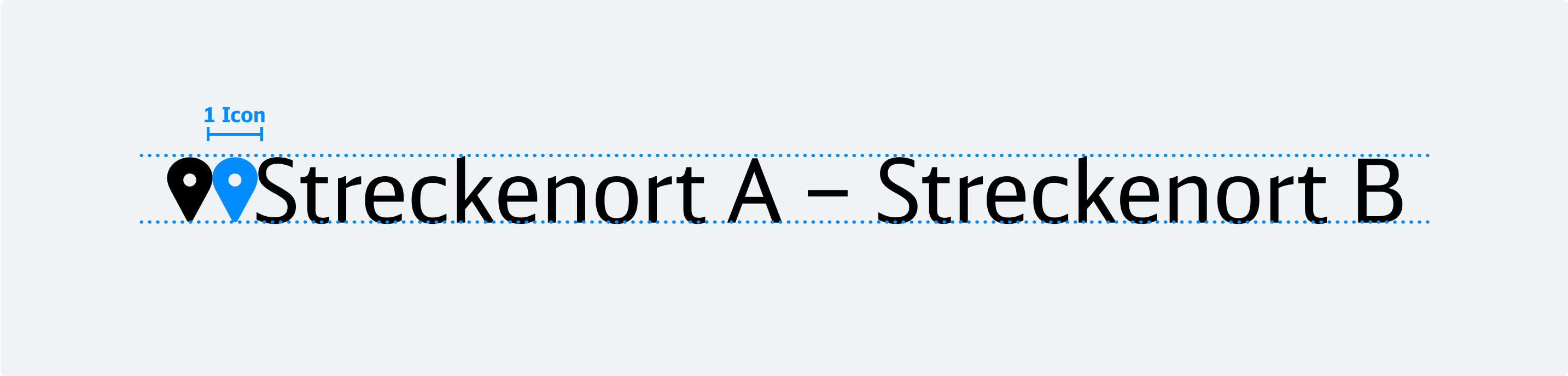 Die zweite Ebene visualisiert die betroffene Strecke – flexibel einsetzbar, auch für Einzelpunkte. Die Schriftgröße beträgt 60 % der Headline und wird durch ein Stecknadel-Icon (Destination – Solid 24dp) eingeleitet. Das Icon entspricht der Versalhöhe, hat die Schriftfarbe und einen festen Abstand zum Text. Start- und Zielpunkt werden durch einen Gedankenstrich mit Leerzeichen getrennt. Die Strecken-Darstellung wird in DB Neo Head Regular geschrieben und und wird abhängig vom Hintergrund in Schwarz oder Weiß eingefärbt.
