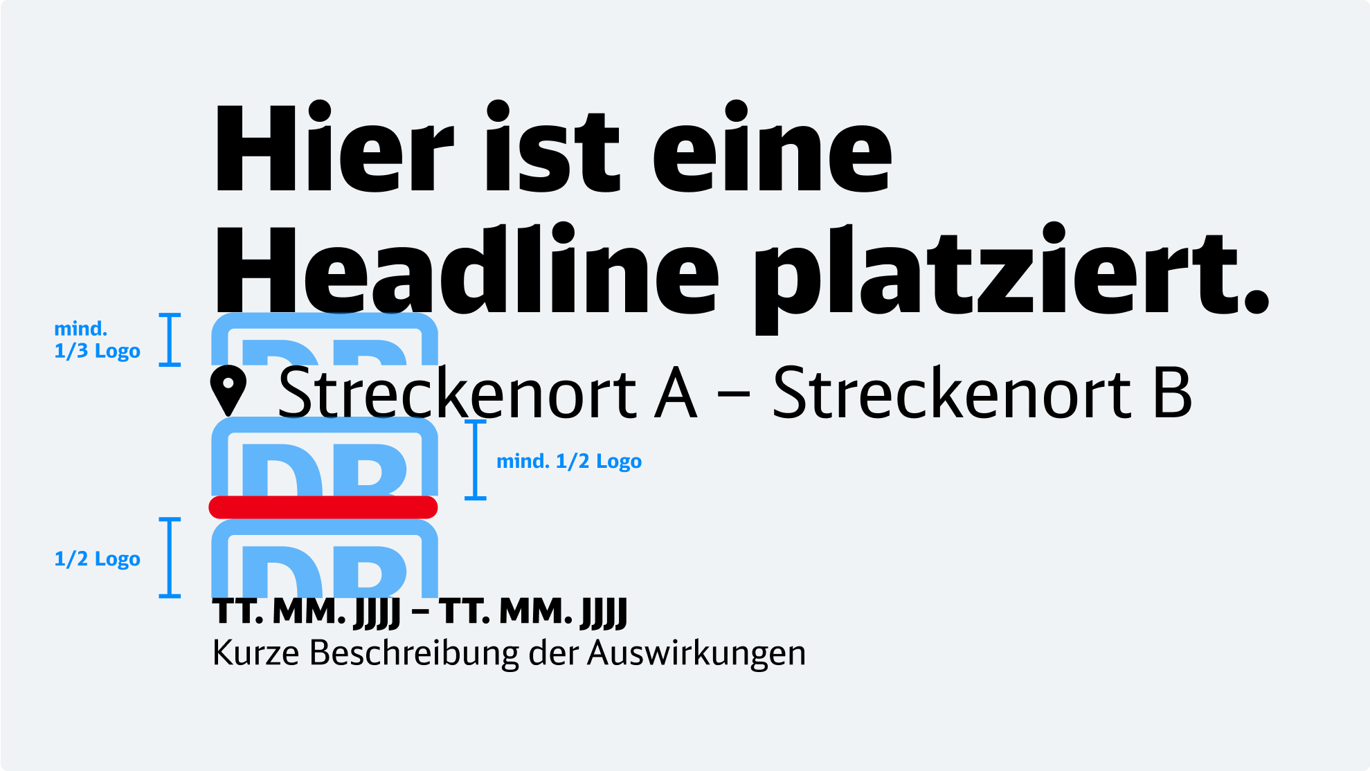Die Größe des DB-Logos im Format gibt die Abstände der inhaltlichen Ebenen vor: Der Abstand zwischen Headline und Strecken-Darstellung beträgt 1/3 der Logo-Höhe, zur Puls-Anzeige 1/2. Zwischen Strecke und Puls sind mindestens 1/2 Logo-Höhe einzuhalten.