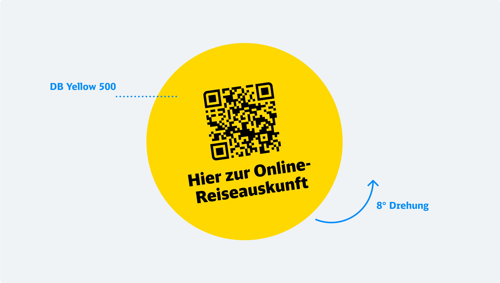 Der Störer hebt wichtige Inhalte, wie beispielweise Hinweise oder QR-Codes, hervor. Im Kommunikationsmuster erscheint er in DB Yellow 500 und ist um 8° geneigt.