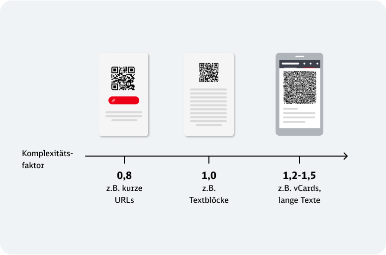 Je mehr Daten ein QR-Code enthält, desto komplexer wird sein Muster – und desto größer muss der Code dargestellt werden. Der Komplexitätsfaktor unterstützt dabei, die passende Größe des QR-Codes abhängig vom Inhaltstyp zu bestimmen.